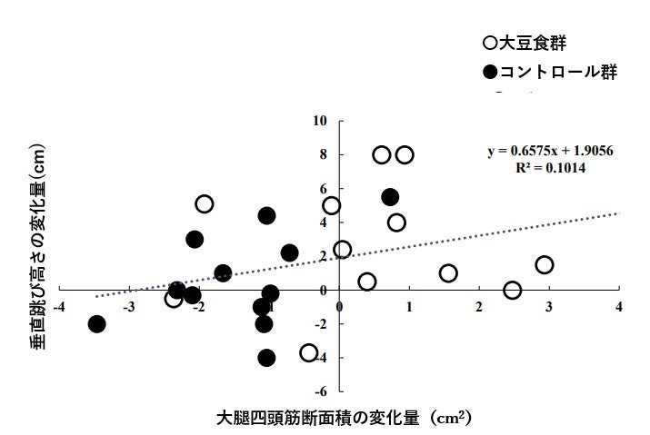 グラフは、大豆食群とコントロール群における筋断面積の変化量と跳躍力の相関について解析しました。