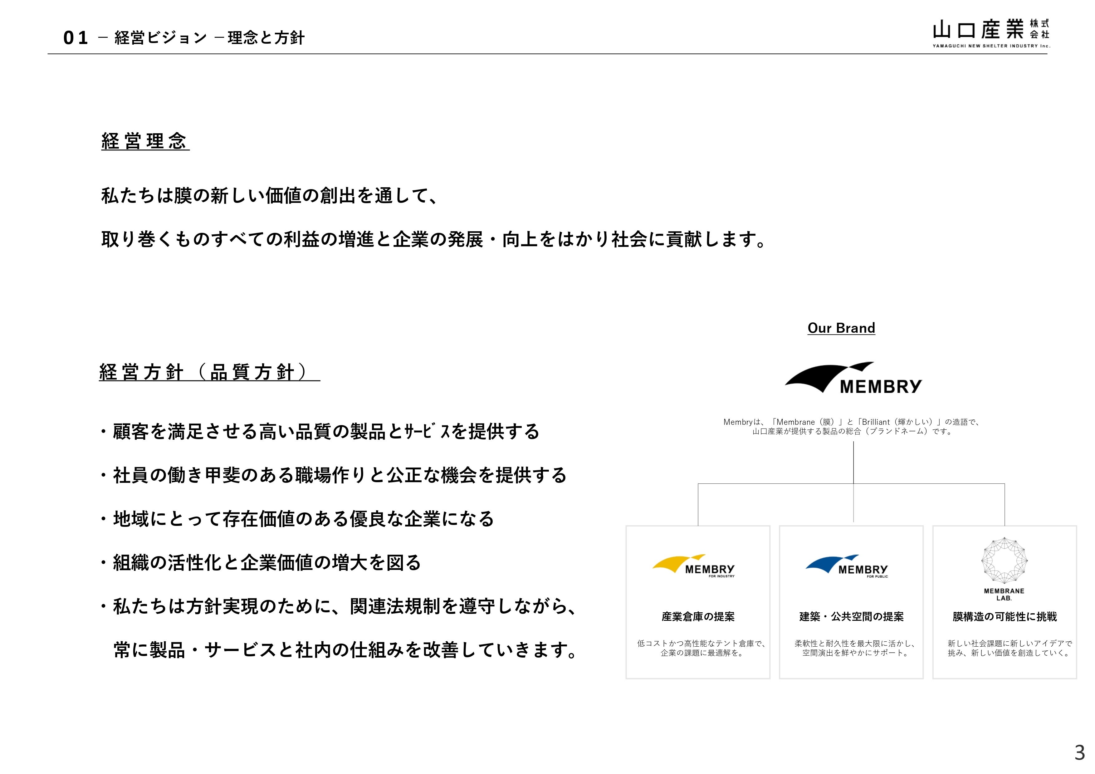 山口産業では、経営ビジョン「Wrap The Future-膜構造で未来を包む」を実現する三つの柱として「より環境負荷の少ない事業を実現」「地域と共存する企業へと成長」「持続可能な膜産業を構築」をあるべき将来像として設定。