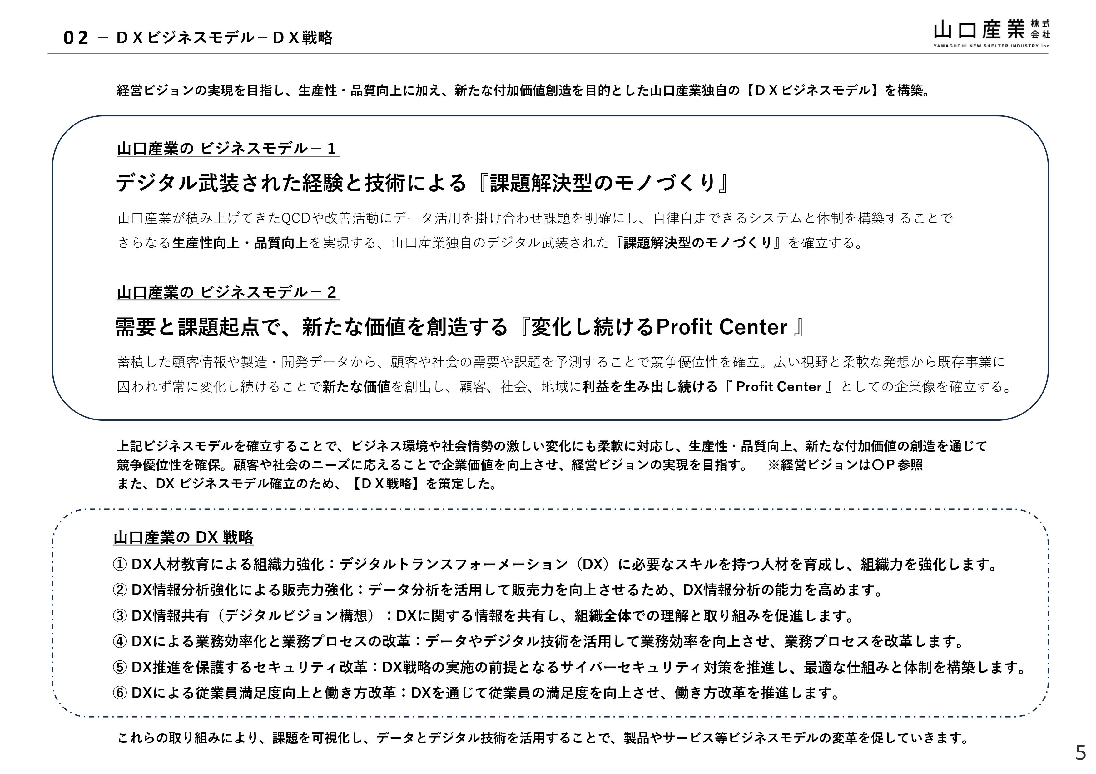 経営ビジョンと将来像を実現するため、生産性・品質向上に加え、新たな付加価値創造を目的とした山口産業独自の2つのDXビジネスモデル『デジタル武装された経験と技術による課題解決型のモノづくり』『需要と課題起点で、新たな価値を創造する変化し続けるProfit Center 』を設定しました。
