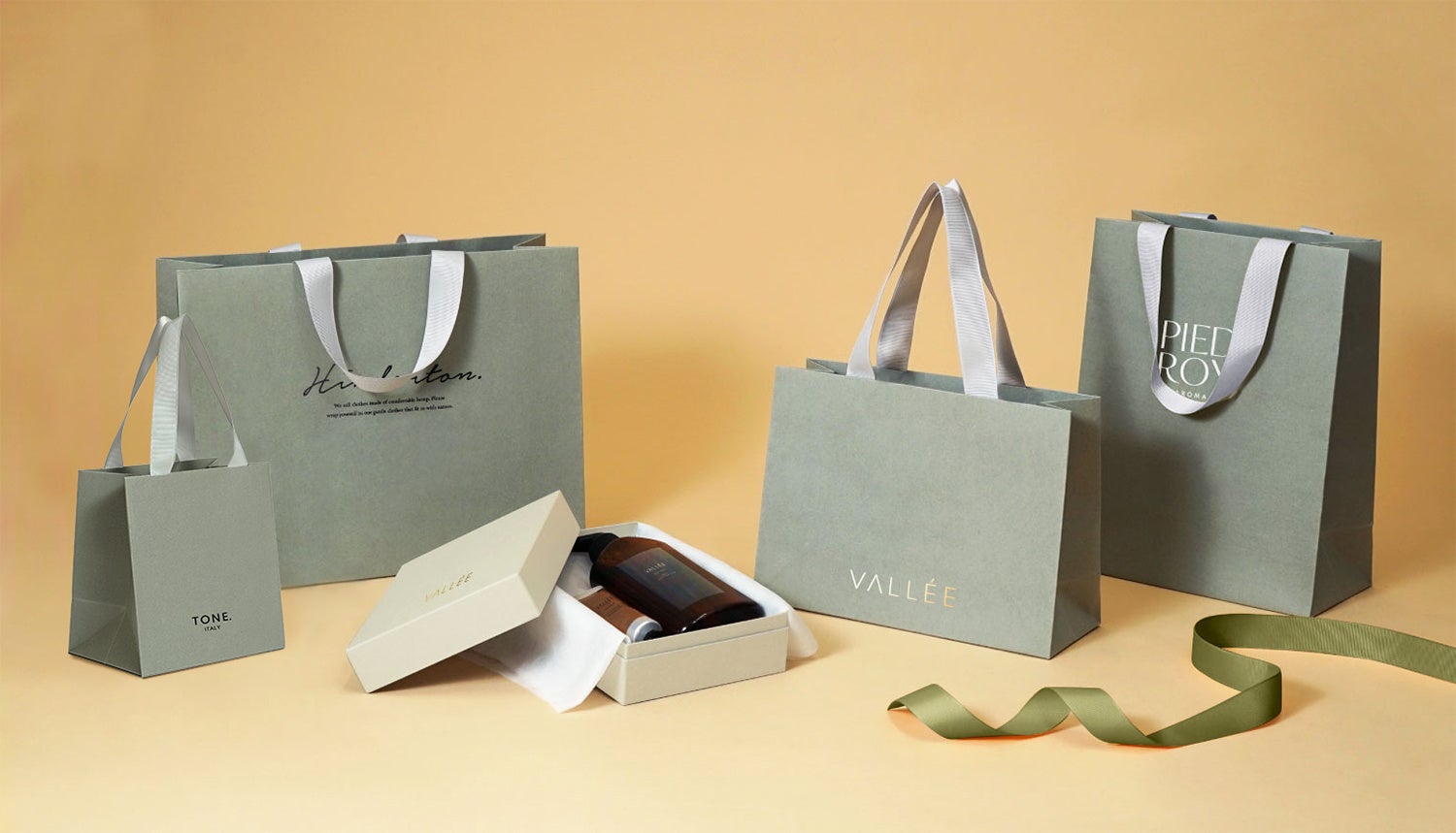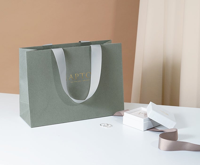 アパレルやコスメ、ジュエリー業界から人気のライトグレーで統一された高級感のあるオリジナル紙袋を、驚きの短納期(10日〜)・小ロット(100枚〜)で実現!