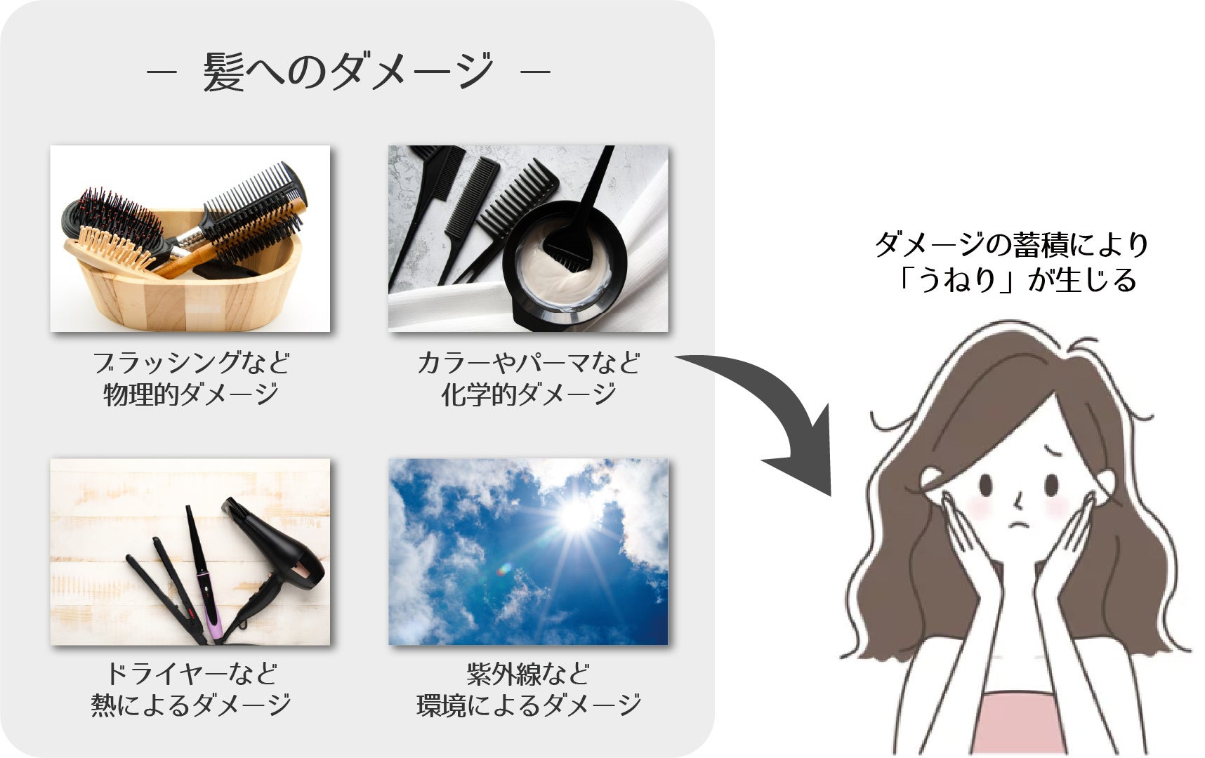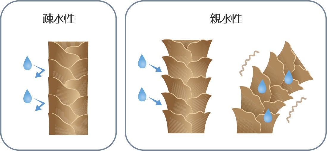 健康な髪の表面は疎水性(水をはじきやすい状態)の構造をしていますが、ダメージを受けると、髪の表面が親水性(水が入り込みやすい状態)になってしまいます。親水性になると、湿気の影響を受けやすくなり、水分を含んで膨張する部分と膨張しない部分の差が出るため、うねりが生じます。
