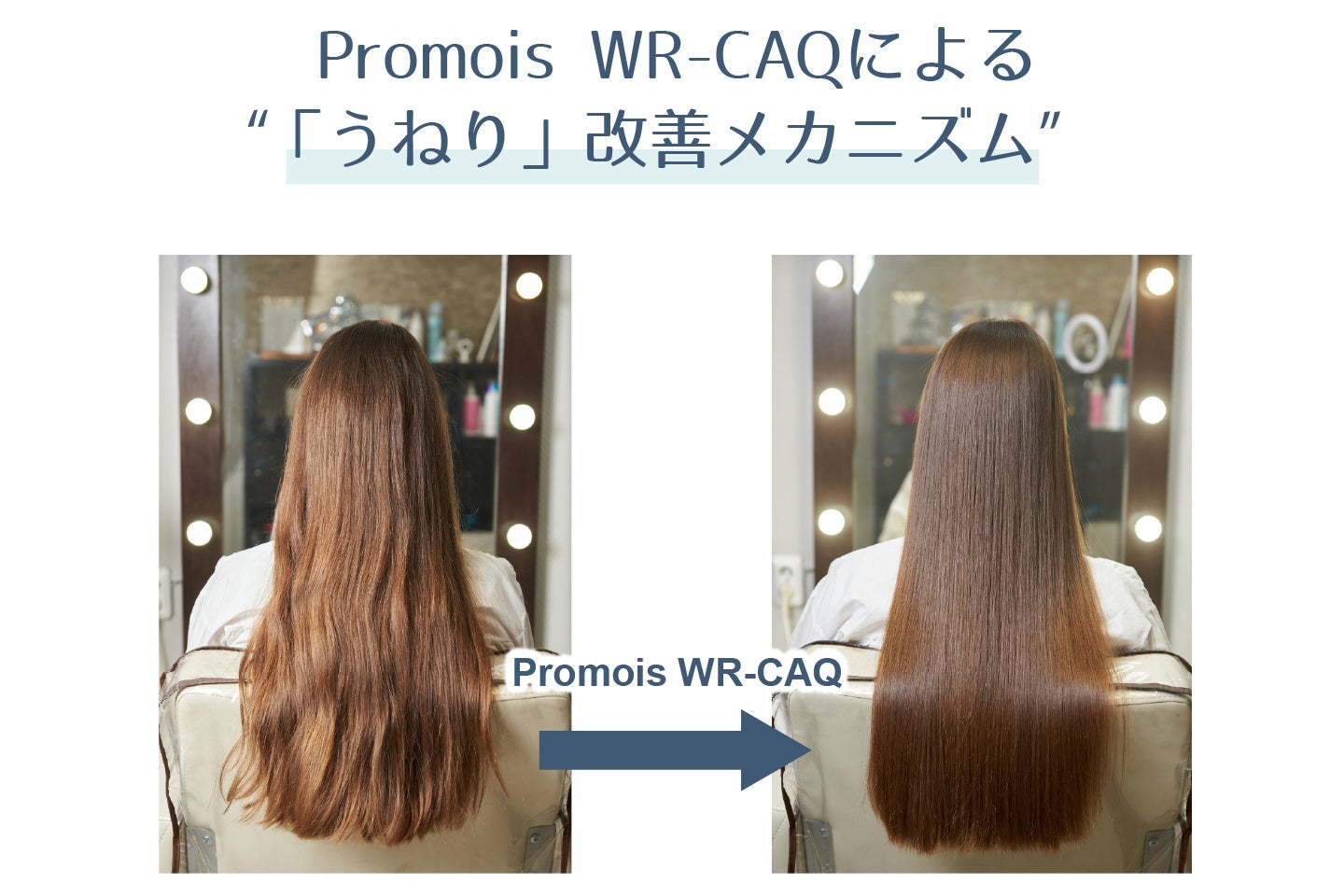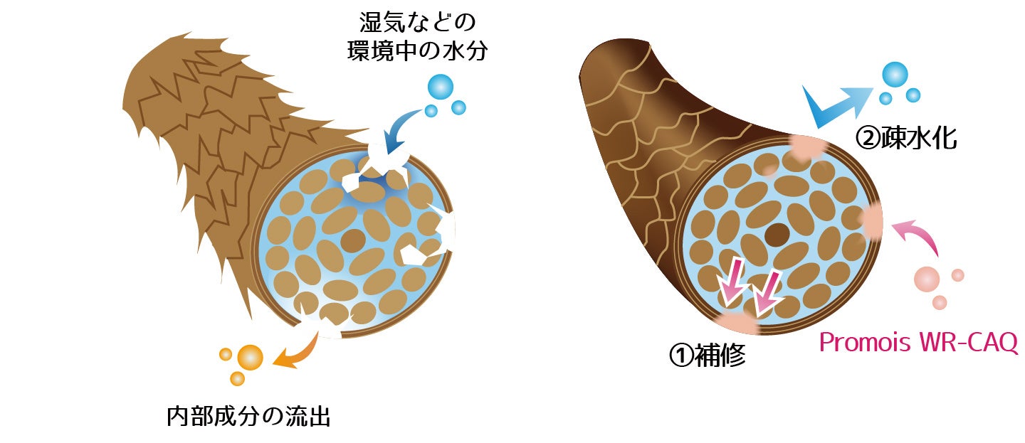 Promois WR-CAQは、①髪のダメージ補修、②疎水化による水分コントロール(髪を出入りする水分の制御)により、髪の変形を抑制し、「うねり」を改善します。