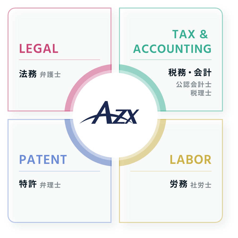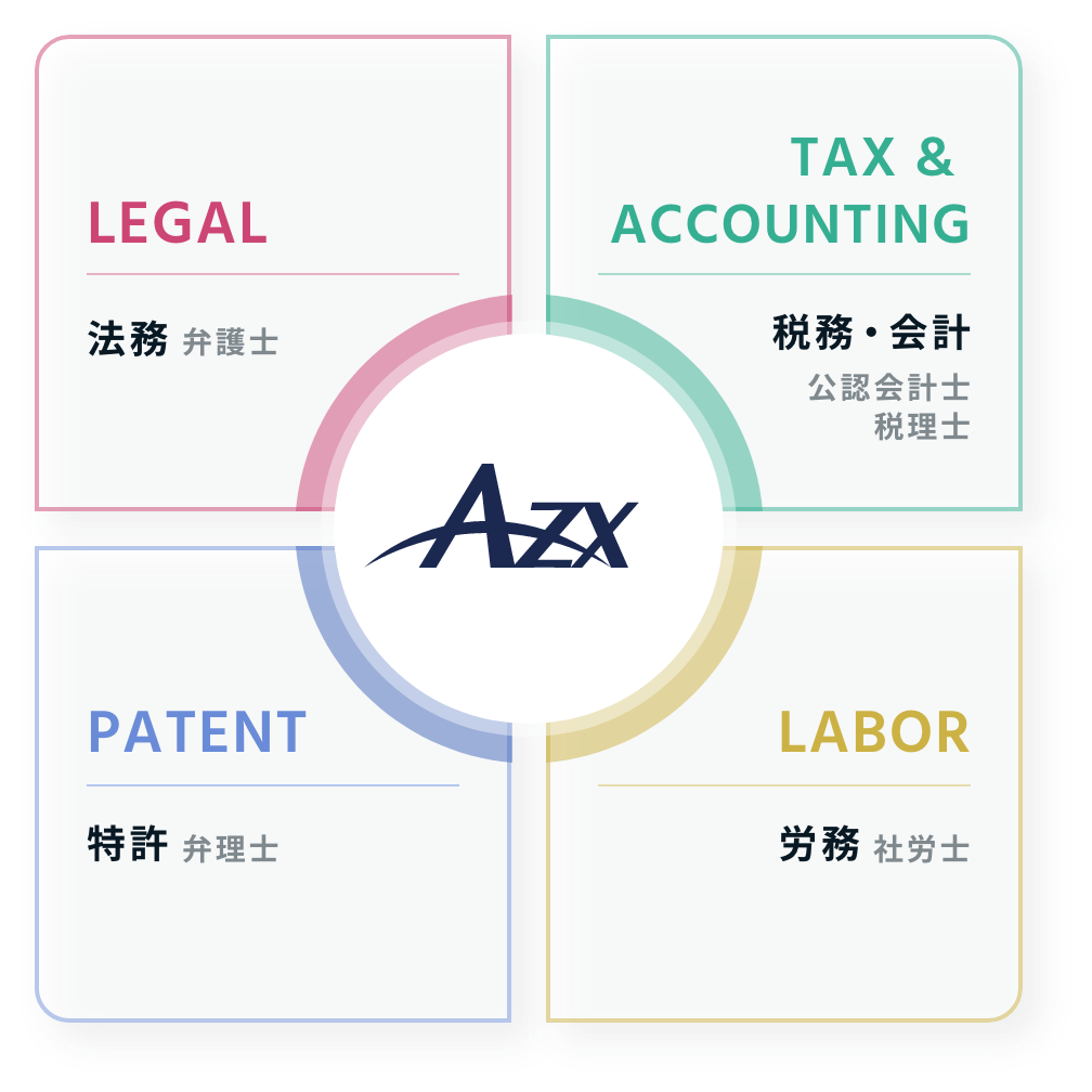 AZX総合法律事務所 / AZX総合会計事務所 / AZX国際特許事務所 / AZX社会保険労務士事務所 / AZX Group株式会社 / AZXビジネスサポート株式会社