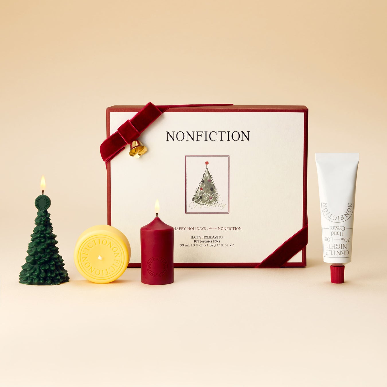 3つの新しい香りで幸せなホリデーを完成させるキャンドルオブジェギフトセット。 クリスマスツリー、甘いバニラケーキ、一杯のカクテルが、年末の雰囲気をより一層盛り上げるムードを演出します。これらの3つのクリスマスアイテムは、ノンフィクションならではの感性を加えたホリデーの香りをまとい、新たに誕生しました。限定数量でお届けするこのセットは、ノンフィクションのシグネチャーハンドクリームとハッピーホリデーキットで構成されており、ギフトに特別感をプラスします。すべての人に幸せを届ける、小さな魔法のような贈り物をぜひお楽しみください。