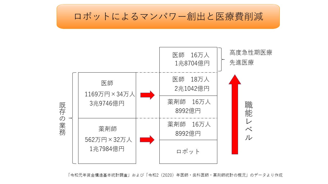 現状では薬剤師は対物業務に忙殺されて、対人業務に時間を割くことができず、患者や国民に対して十分な医療サービスを提供することができていません。日本全体で調剤自動化が進めば、薬剤師の業務のうち約半分をロボットに置き換えることができます。そうすれば、薬剤師は医師の仕事の中の薬物治療に関わる多くの部分を分担(タスクシフト)できます。過労死するほど過酷な医師の働き方は劇的に改善され、医師はより高度な先進医療や急性期医療に専念できます。これにより、日本全体で医療の質が高まり、国民はより安全で質の高い医療サービスを受けられるようになります。