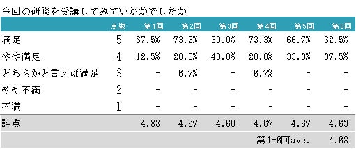 第1~6回(全7回)の研修における受講者アンケートの結果は、平均評点4.68と非常に高い満足度が得られております。講義では毎回100ページを超える事業再生に関するオリジナル講義資料を用いており、ワークセッションでは過去実例などを参考に架空の再生企業を設定し、実際に事業デューディリジェンスや財務モデリングに取り組んでいただくなど、非常に実践的な内容となっております。また、全7回のうち2回(2日間×2回=4日間)は対面形式での講義・ワークを実施しており、その中で金融機関様同士の交流・意見交換が図ることができるという点も、「再生CAMP」の特長の1つとなっております。