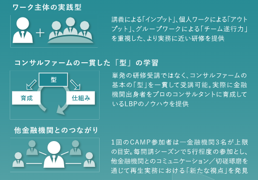 「再生CAMP」とは、金融機関側のニーズおよび人的リソースの制約を考慮し、実践的(ワーク形式中心)であり、かつ、業務と研修の両立が可能となる「Camp形式」で実施する研修です。