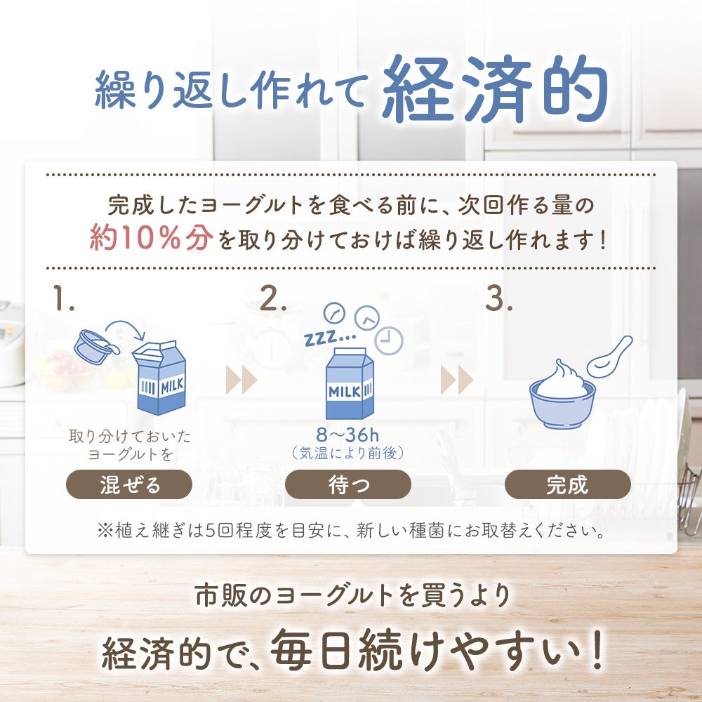 完成したヨーグルトを食べる前に、次回作る量の約10%を取り分けておけば、繰り返し作れます(植え継ぎ)。市販のヨーグルトを買い続けるよりも経済的にもっちりヨーグルトをお楽しみいただけます。