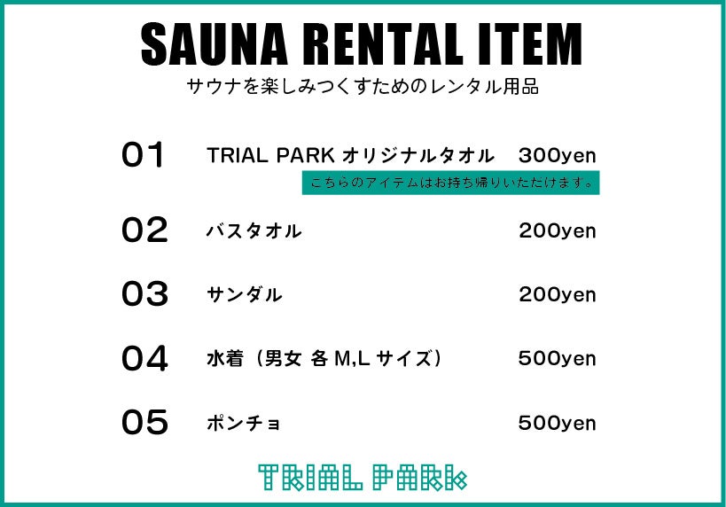 必須アイテムである水着をはじめ、サウナの楽しむためのアイテムがその場でレンタルできます。