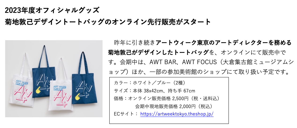 昨年に引き続きアートウィーク東京のアートディレクターを務める菊地敦己がデザインしたトートバッグを、オンラインにて販売中です。会期中は、AWT BAR、AWT FOCUS(大倉集古館ミュージアムショップ)ほか、一部の参加美術館のショップにて取り扱い予定です。