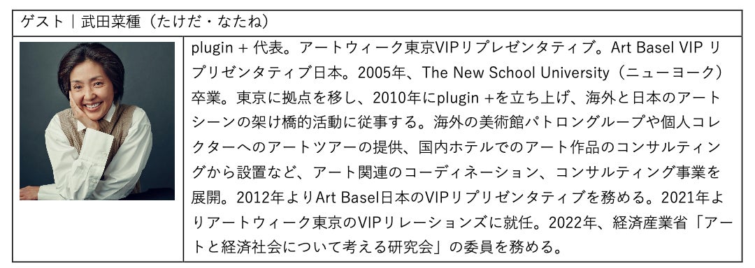アートをコレクションしてみたいと考える方々を対象に、インディペンデントキュレーターの山峰潤也氏がファシリテーターを務め、アートウィーク東京VIPリプレゼンタティブの武田菜種氏をゲストに、AWT FOCUSとAWT BARを巡りながら、アート鑑賞の方法からマーケットの仕組みまでを立体的にとらえる手引きとなるツアーを実施します。今回のAWT FOCUSに導入される「系譜学」の考え方に沿って、展覧会の各テーマの中だけでなく、時にはテーマも超えて、作品同士の連続性や時間軸上での変化を読み解く視点を、山峰氏がレクチャーします。展覧会や作品の見方を学んだあとは、日本とグローバルなアートシーンの架け橋として活躍する武田氏による「実際に作品を購入しコレクションを形成していくには」といったアートコレクションへの理解を深めるミートアップを、AWT BARの見学とあわせて実施します。