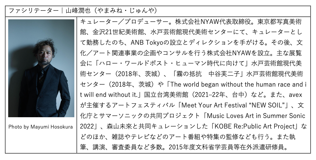 内容 | ・山峰潤也氏によるAWT FOCUSの鑑賞ガイドツアー ・AWT BAR見学 ・武田菜種氏による座談会 |