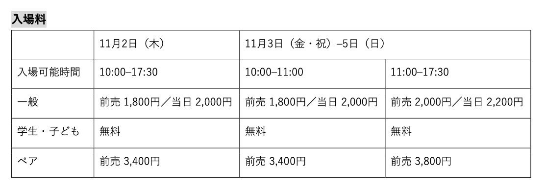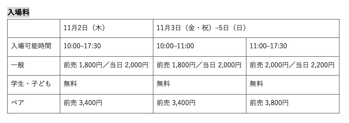 入場料(税込) | 平日 11月2日(木) 10:00–17:30 【一般】当日チケット2,000円 / 前売りチケット1,800円 【ペア】前売りチケット3,400円 土・日・祝日 11月3日(金・祝)–5日(日) 10:00–11:00 【一般】当日チケット2,000円 / 前売りチケット1,800円 【ペア】前売りチケット3,400円 土・日・祝日 11月3日(金・祝)–5日(日) 11:00–17:30 【一般】当日チケット2,200円 / 前売りチケット2,000円 【ペア】前売りチケット3,800円 *学生・子どもは全日程無料 |