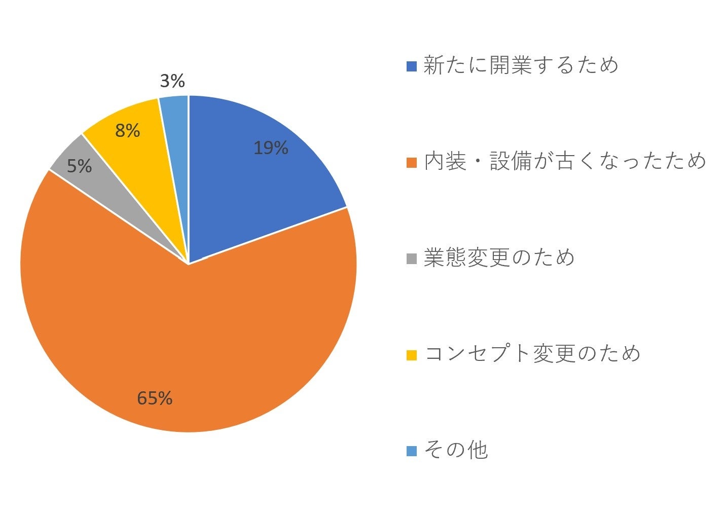 まず【~300万円】の回答では、「内装・設備が古くなったため」が65パーセントとなり過半数を占めています。続いて「新たに開業するため」が19パーセントの割合となりました。