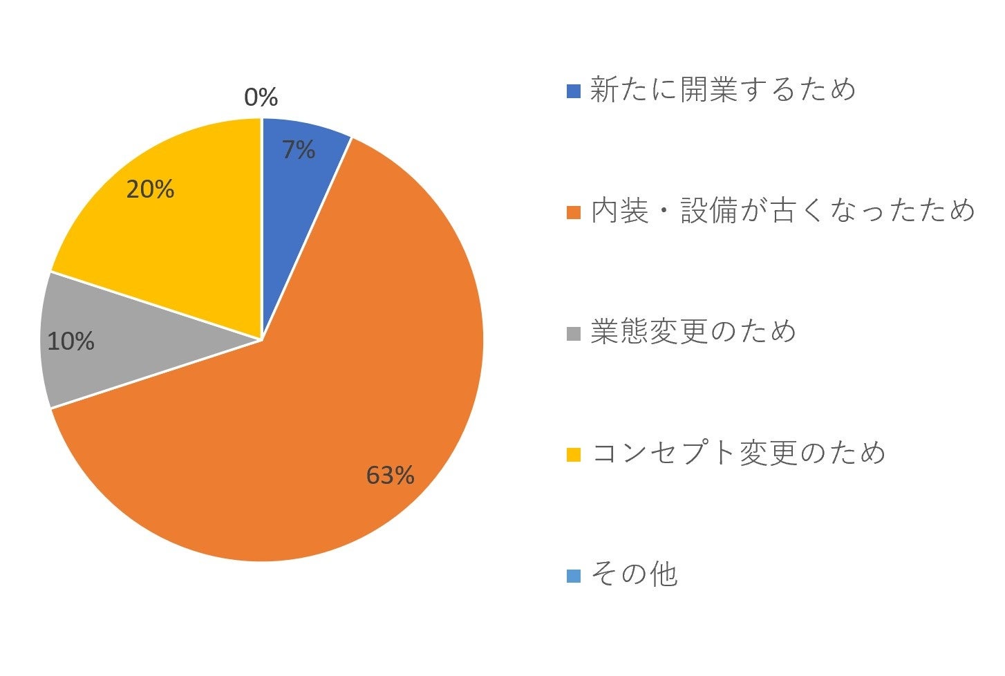 【500~1000万円】の場合も同様に「内装・設備が古くなったため」が63パーセントとなり一番多く票を集めていますが、続いて「コンセプト変更のため」が20パーセントを占め、高い比率となりました。