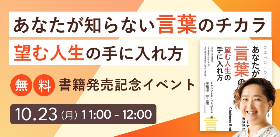 日本初上陸のオントロジカル・コーチングの普及を目指す一般社団法人日本オントロジカル・コーチング協会は、代表理事である桜庭理奈が訳者・監修者を務めた書籍「あなたが知らない言葉のチカラ 望む人生の手に入れ方」の出版記念イベントを2023年10月23日(月)に開催します。米国ベストセラー作家で原書著者のチャルマーズ・ブラザーズ氏をゲストに迎え、本書籍のテーマである言葉のチカラと幸せについて語ります。