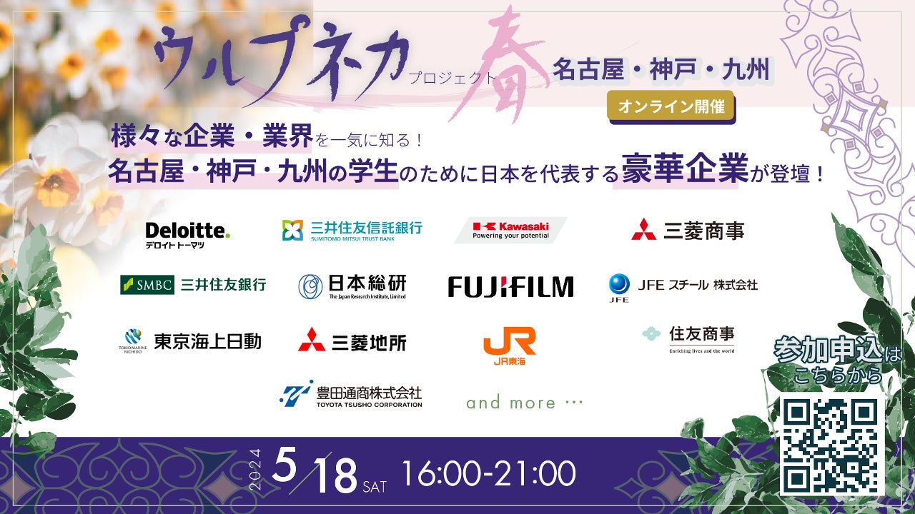 株式会社TKF Projectは、北海道・東北・名古屋・神戸・九州の各地域の大学に在籍する学生を対象に、各地域最大規模 企業合同イベント『ウルプネカプロジェクト 2024年 春』を開催いたします。
