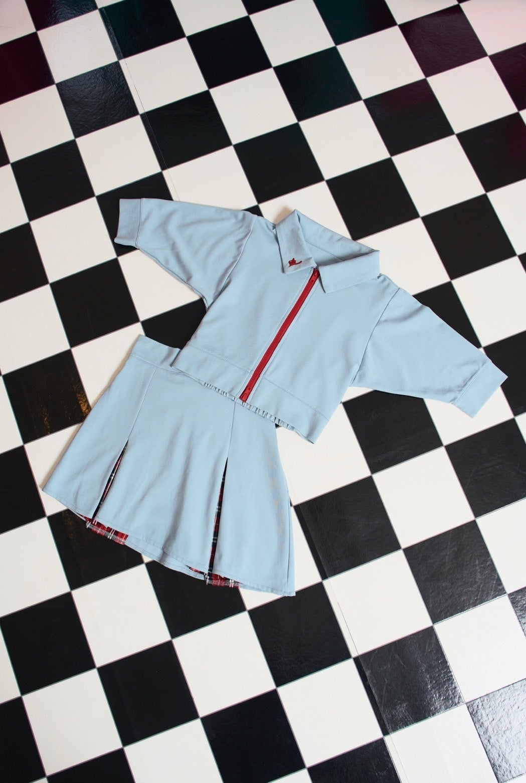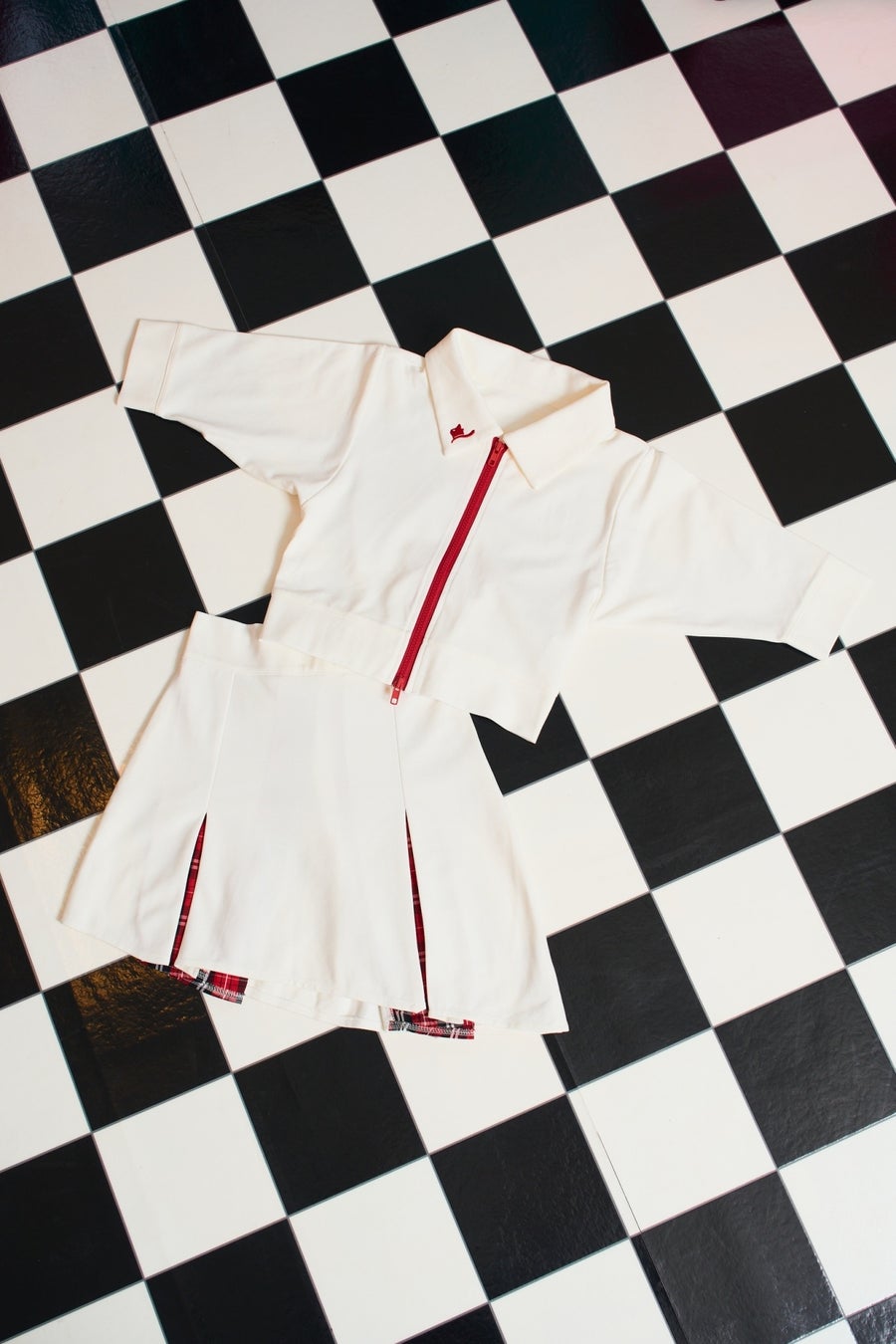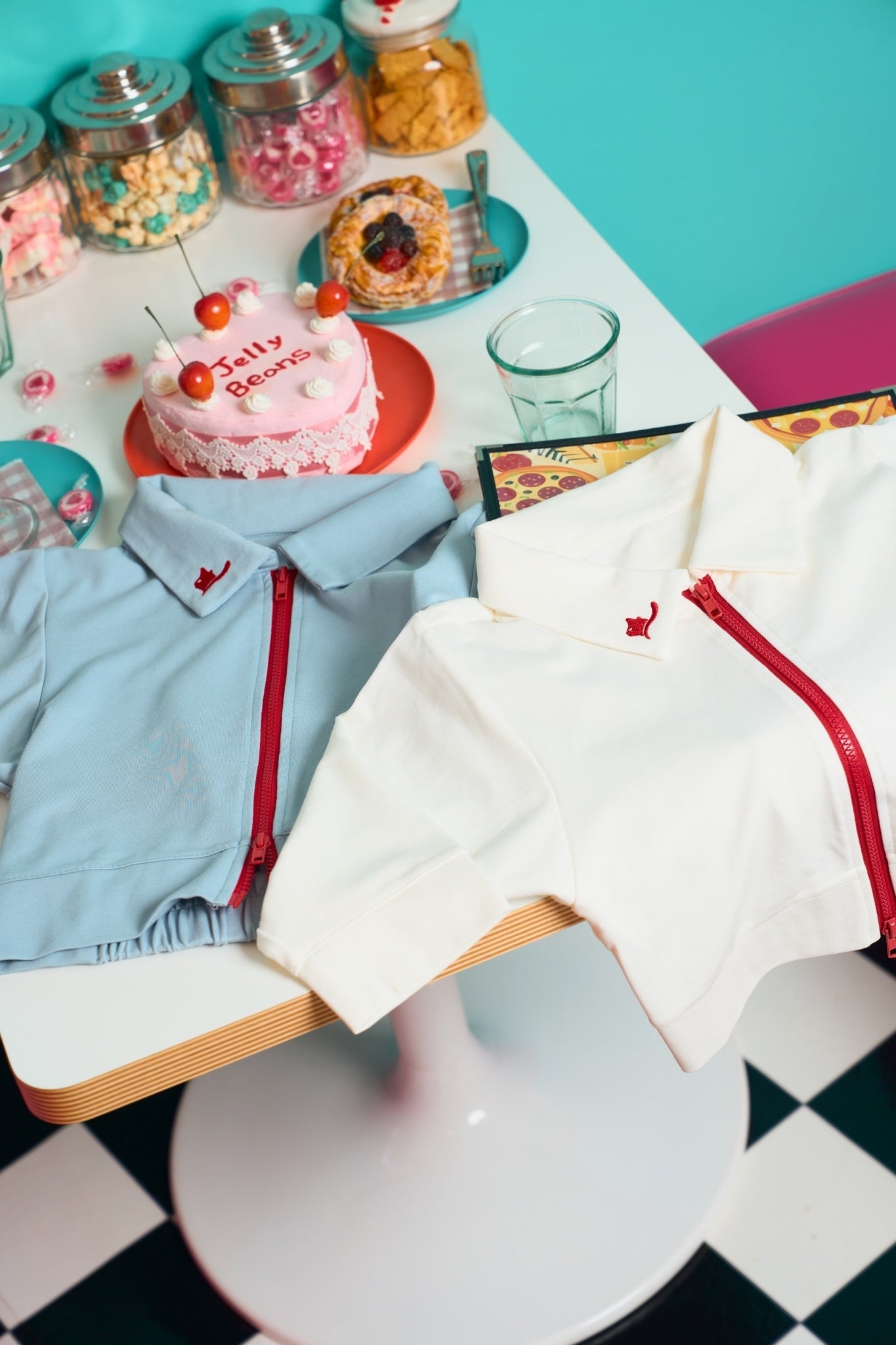 トップスは短丈でタイトなサイズ感が特徴。伸縮性のある生地感でストレスフリーな着心地を実現。襟元の猫のモチーフがポイントとなっている。