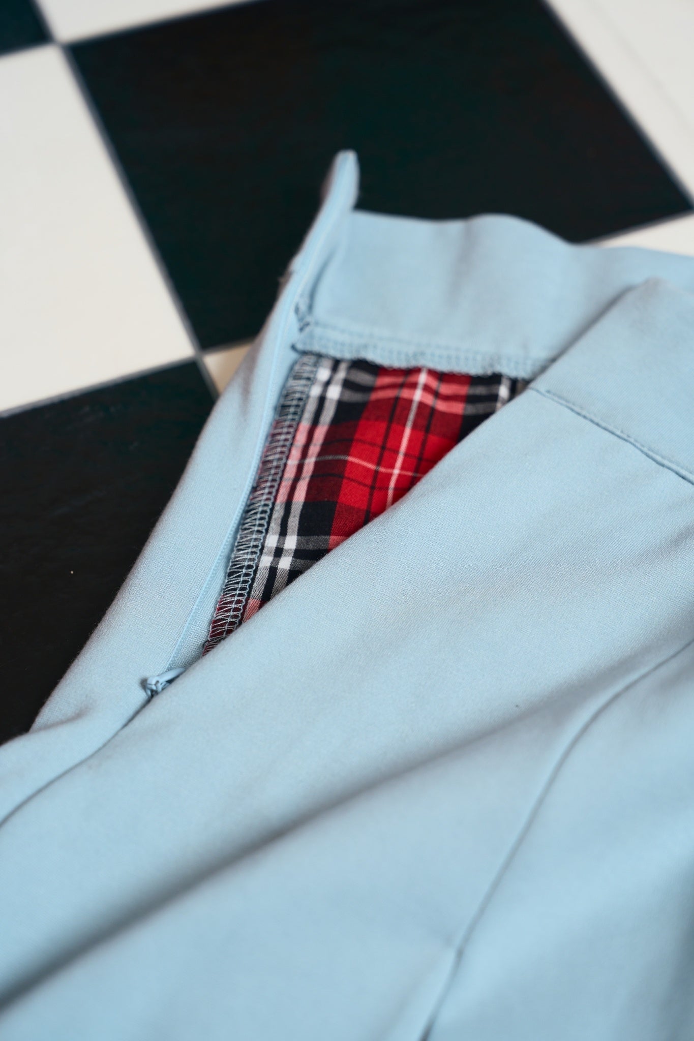 スカートは丈の長さを斜めにした丈感が特徴。ウエストはゴムを使用している為、締め付けのない着心地。スリットから除くチェック柄がポイントとなっている。