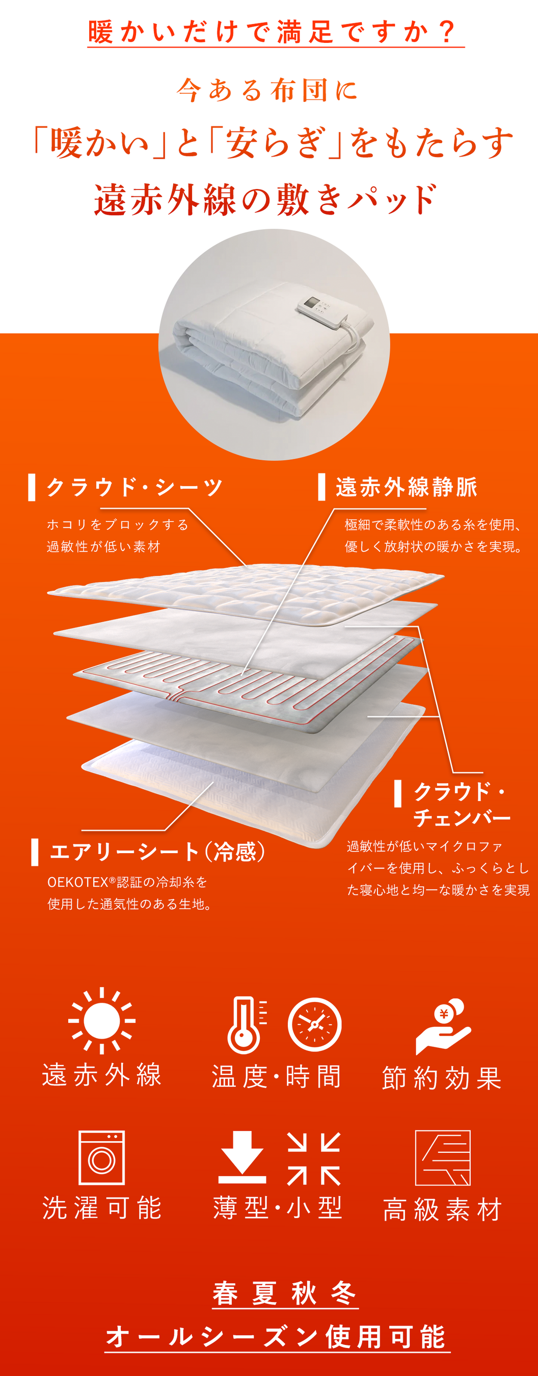冬以降使えない他の温かい布団や暖房器具とは一線を画します。ぜひ春夏秋冬すべての季節、毎日遠赤外線のを使用を推奨しています。