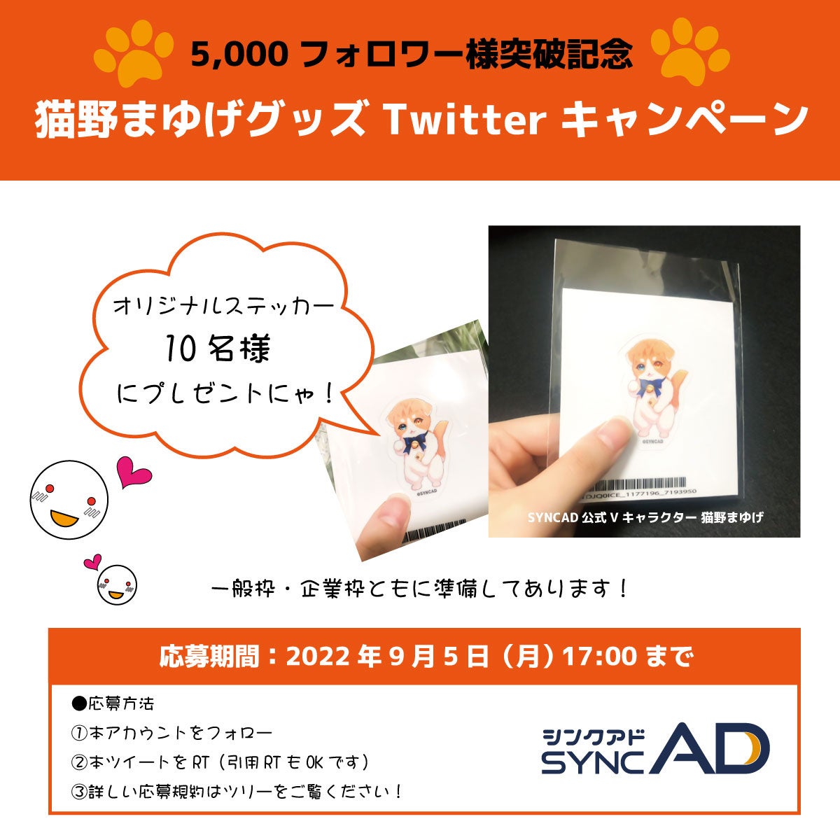 株式会社シーピアーズ(本社:東京都港区、代表取締役社長:柳田達也、以下シーピアーズ)が運営するWebマーケティングメディア「SYNCAD(シンクアド) URL:https://syncad.jp/ 」が運営するTwitter( https://twitter.com/sync_ad )にて、5,000フォロワーを記念して公式Vキャラクター「猫野まゆげ(MAYUGE NEKONO)」オリジナルステッカープレゼントキャンペーンを実施中。公式TwitterをフォローしてキャンペーンツイートをRTすれば参加できます。