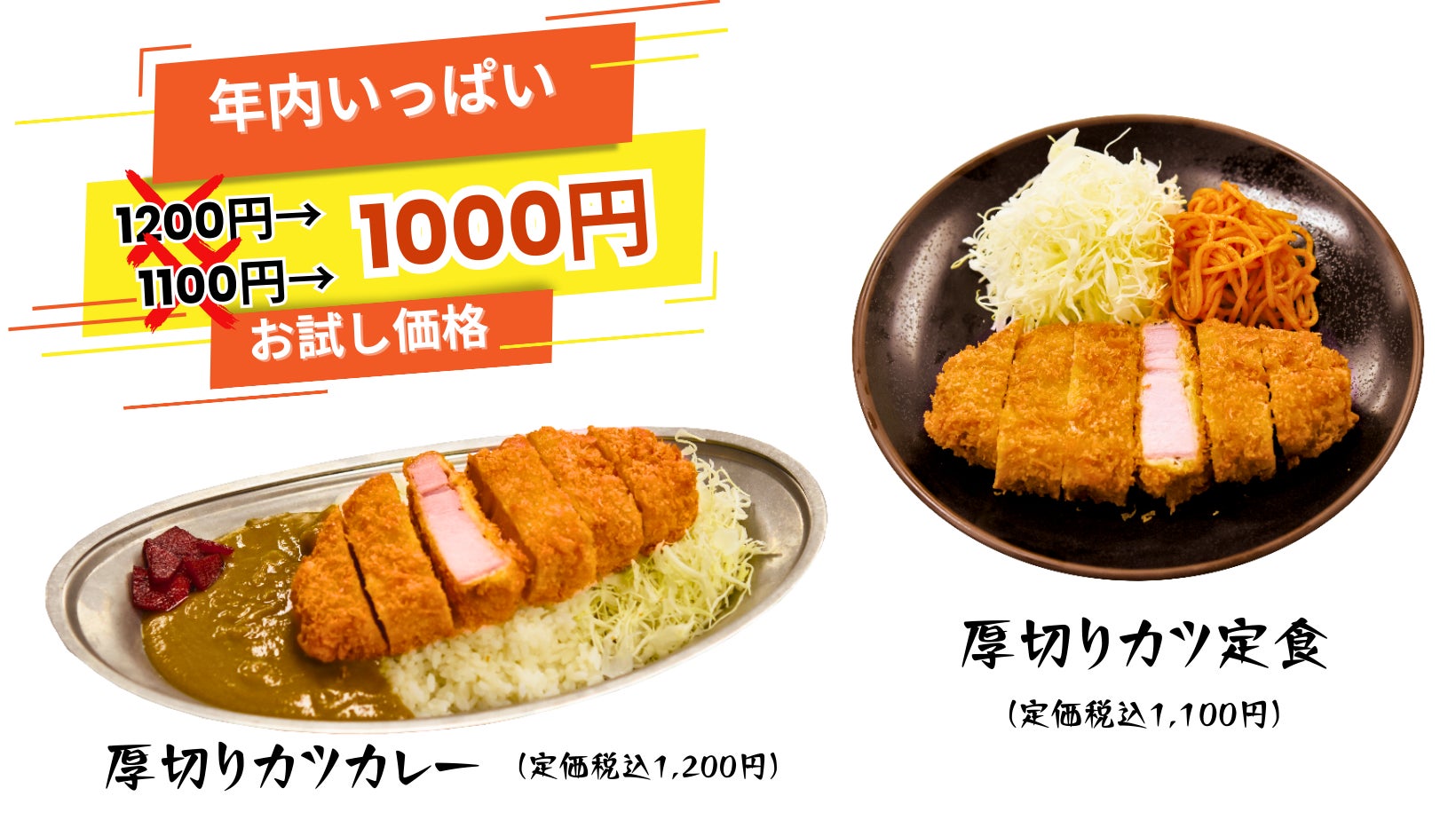 3段階の厚みを用意しておりますが、その入口となる「厚切りカツカレー」「厚切りカツ定食」を年内期間限定価格1,000円で提供いたします!(2023年12月の最終営業日まで適用)