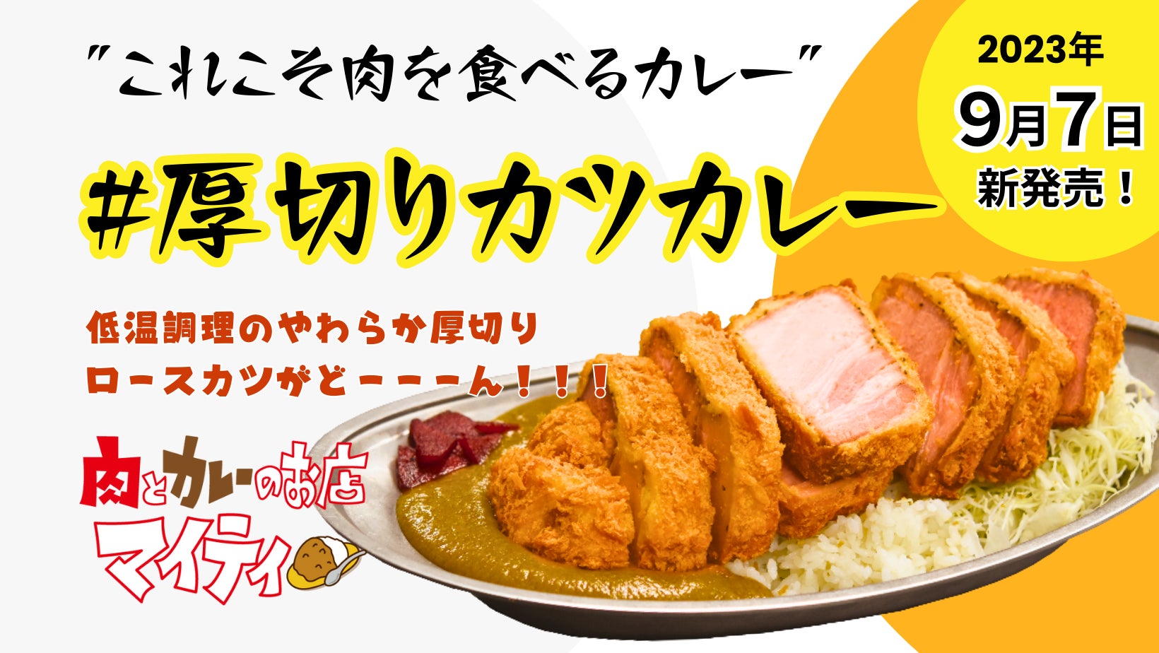 お肉とカレーのメガ盛りを提供する「肉とカレーのお店マイティ」から「これこそ肉を食べるカレー」と感じさせる厚切りカツカレーが新登場です。ブランド名に”肉”が入る我々としてはお肉を調理する技術の高さに自負があります。だからこそ一般的に厚切りとされる厚みだけでは満足せず「厚さ約5cmの約400g」のロース肉を使った「超極厚カツカレー」もご用意いたしました。低温調理で芯までしっとり柔らかく大ボリュームのカツをご堪能くださいませ!