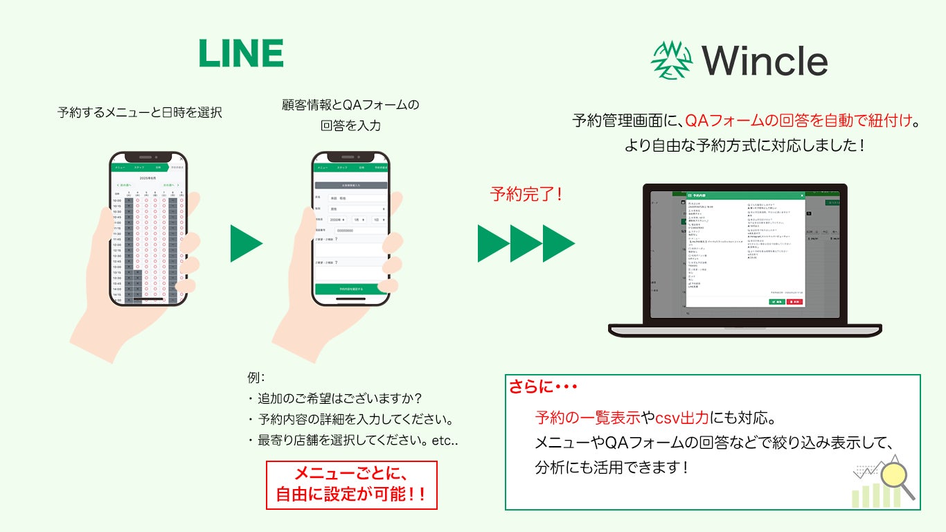 QAフォーム機能は、LINEの予約フォーム上で、ユーザーの選択内容に応じて質問項目を自動的に切り替えられる、Wincle独自の予約最適化機能です。