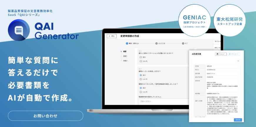東大松尾研発AIスタートアップ・株式会社EQUES(本社:東京都文京区、代表取締役:岸尚希、以下「EQUES」)は、医薬品製造の品質保証に関わる文書業務の効率化AI SaaS「QAI」から、第一弾となる「QAI-Generator」をリリースし、変更申請書の自動生成機能を提供いたします。