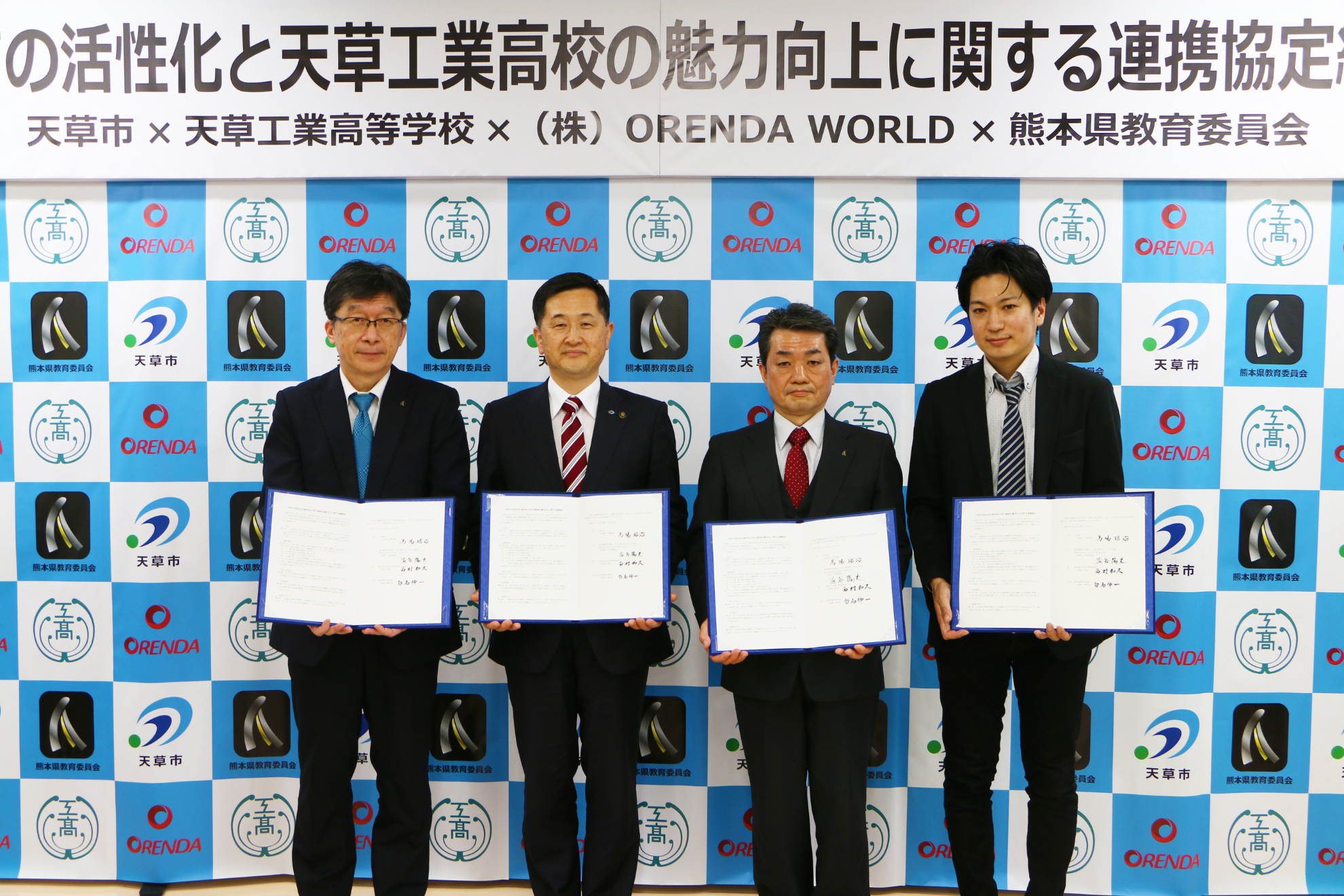 本協定では、ORENDAWORLDが展開する『LEVEL BOOST』(レベルブースト)を通じて、熊本県立天草工業高等学校へ実務に直結する技術をカリキュラムとして提供することで生徒の就職を後押しし、またORENDAWORLDが新設する「天草スタジオ」を、新たな就職先として提供することで、地元生徒の雇用創出を実現できると確信し、締結に至りました。