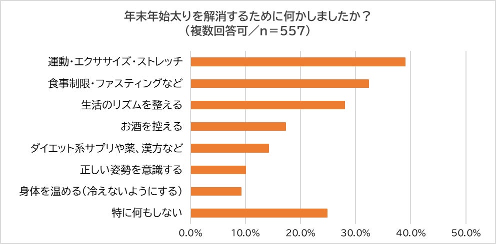 それでは、「その変化を解消するために何かしたか?」聞きました。約4割(39.0%)が「運動・エクササイズ・ストレッチ」と回答し最多、以下「食事制限・ファスティングなど」(32.3%)、「生活のリズムを整える」(28.0%)と続きました。