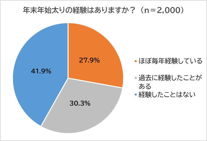 「年末年始太りの経験はあるか?」と聞いたところ、「ほぼ毎年経験している」(27.9%)、「過去に経験したことがある」(30.3%)、「経験したことはない」(41.9%)となり、毎年年末年始太りしている人が3割近くいることがわかりました。