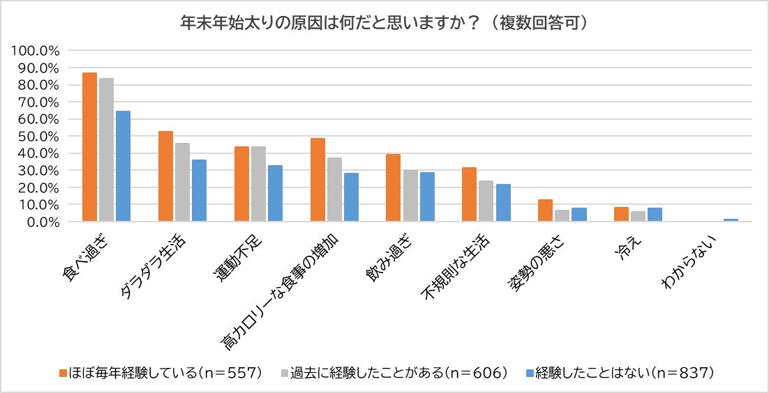 年末年始太り経験者・未経験者それぞれに「原因は何だと思うか?」聞きました。最多はどれも「食べ過ぎ」(毎年経験:86.9%、過去に経験:83.3%、未経験:64.2%)となり、次点の「ダラダラ生活」(毎年経験:52.6%、過去に経験:45.5%、未経験:36.0%)に大きな差を付けました。