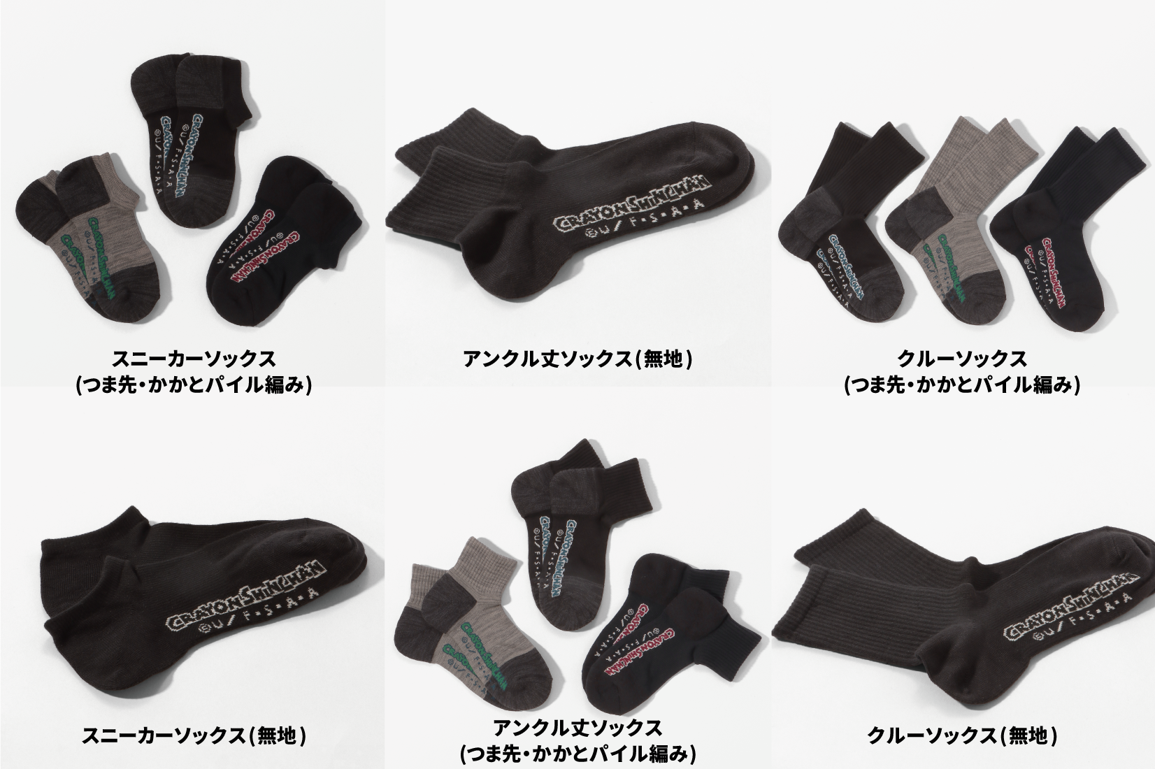 靴下丈はスニーカー・アンクル・クルー丈の3タイプ、生地はクッション性のあるパイル編みの有無が選べる2タイプのバリエーションをご用意しました。お仕事やスポーツシーンなど、生活スタイルや履き心地の好みに合わせて幅広く活躍するラインナップです。