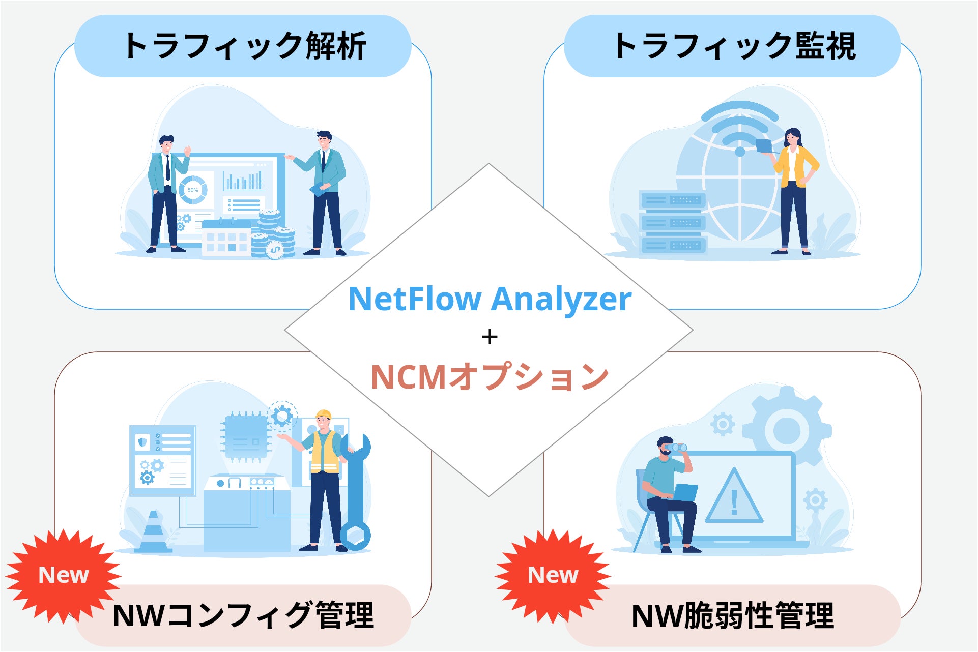 トラフィック解析ツールのNetFlow AnalyzerにNCMオプションを追加することにより、ネットワークで流れるトラフィックの把握と、ネットワーク設定の管理を一元的に行えるようになり、管理業務のさらなる効率化が可能となりました。