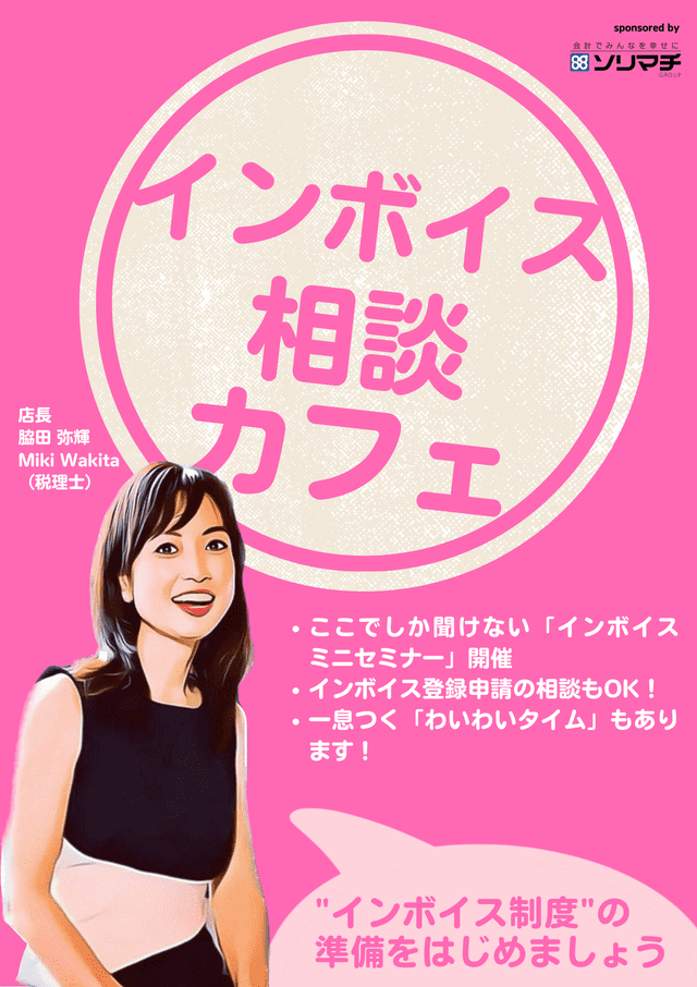 インボイス相談カフェは2023年10月に開始されるインボイス制度に対して、「どう対応したらよいかわからない」「課税事業者になった方がいいの?」「請求書の形式はどう変えたら?」など、様々な疑問を持っている方に向けた、税理士の脇田弥輝先生が店長を務め、相談ができるカフェです。