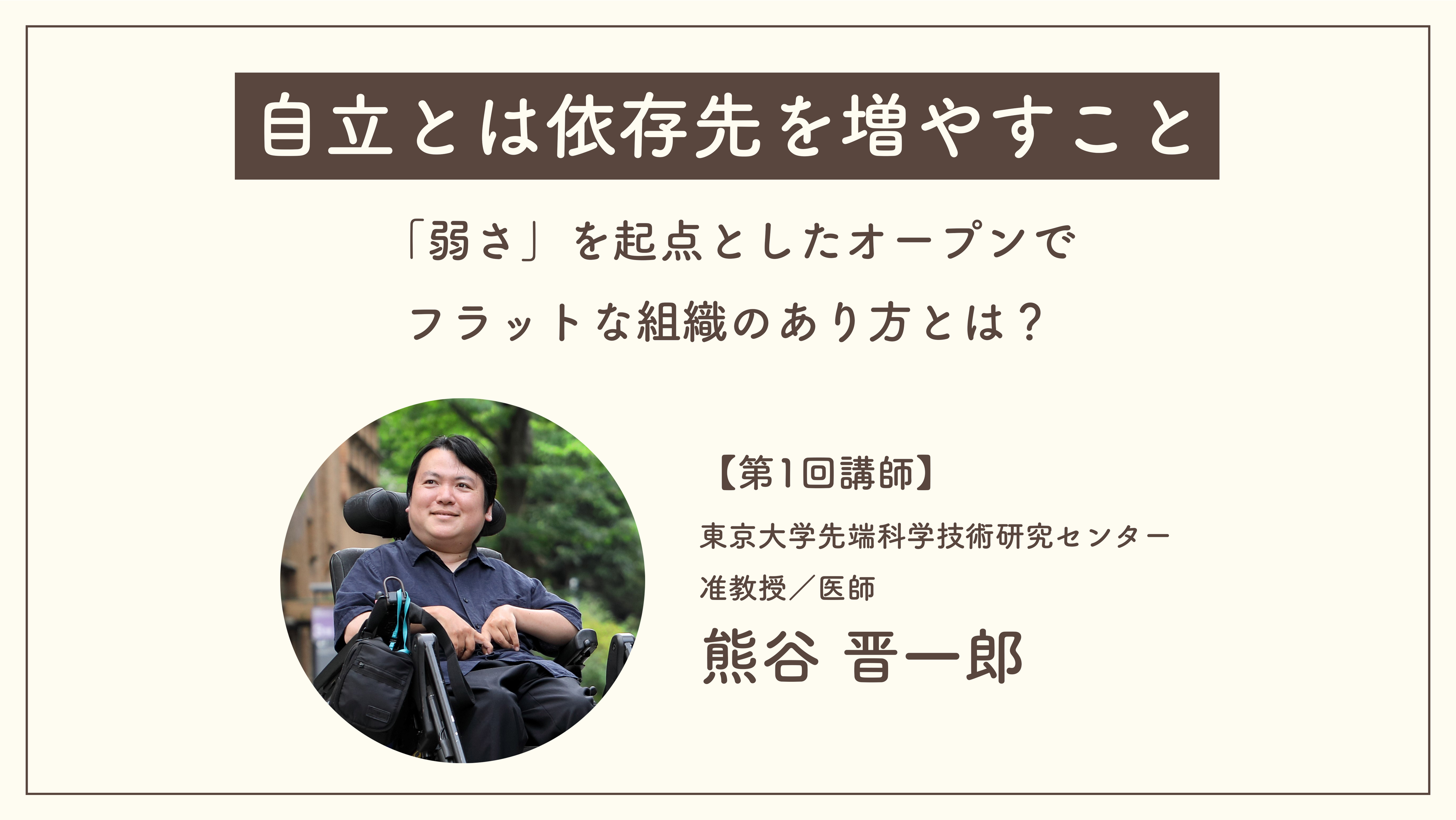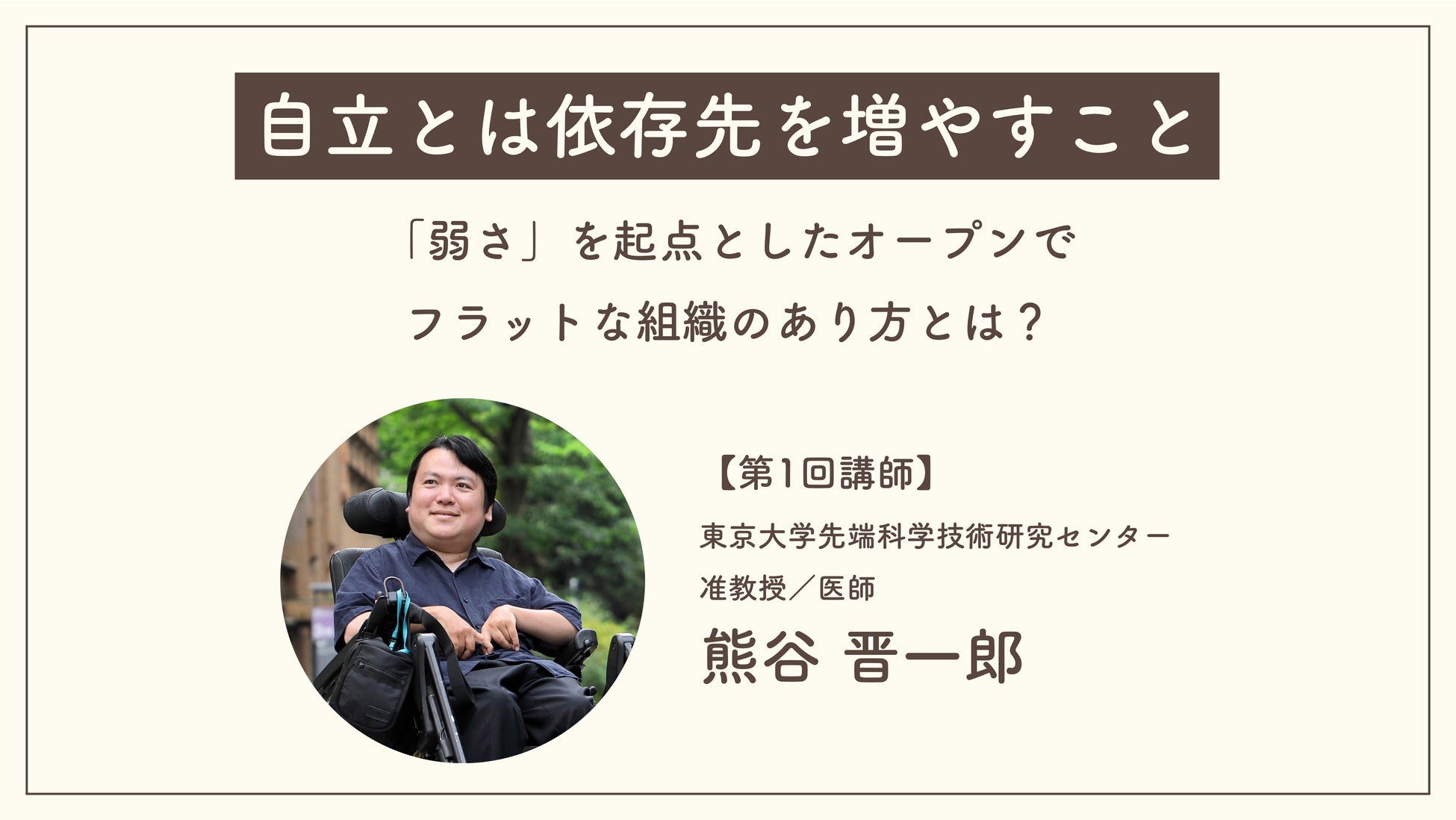 第一弾の講師は、「自立とは依存先を増やすこと」という言葉で多くの共感を集めている、東京大学先端科学技術研究センター准教授で当事者研究を専門とする熊谷晋一郎先生。人の「弱さ」を起点に、相互依存の力を活用し、組織や社会全体の価値を生み出す方法を全5回の講義で学びます。