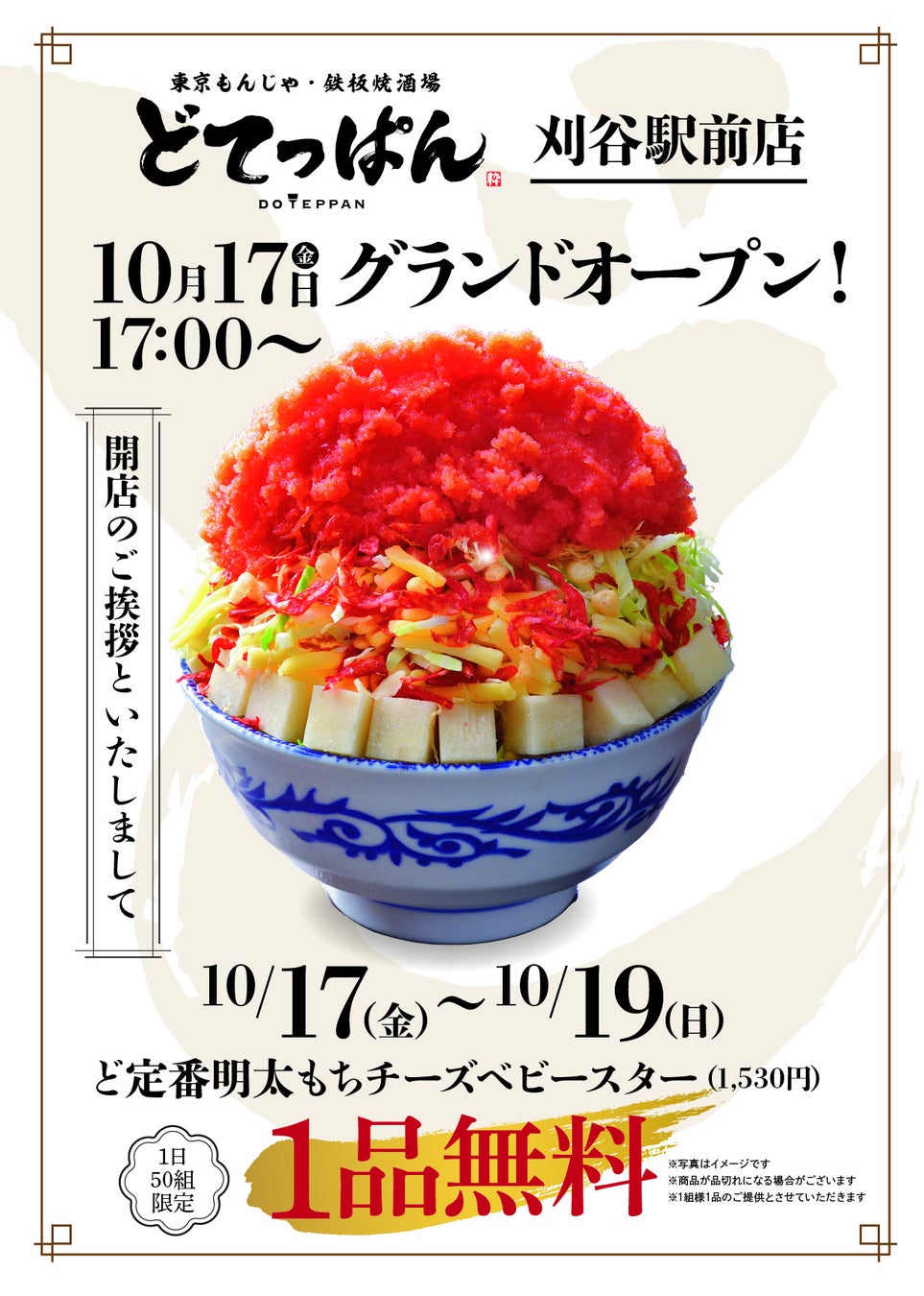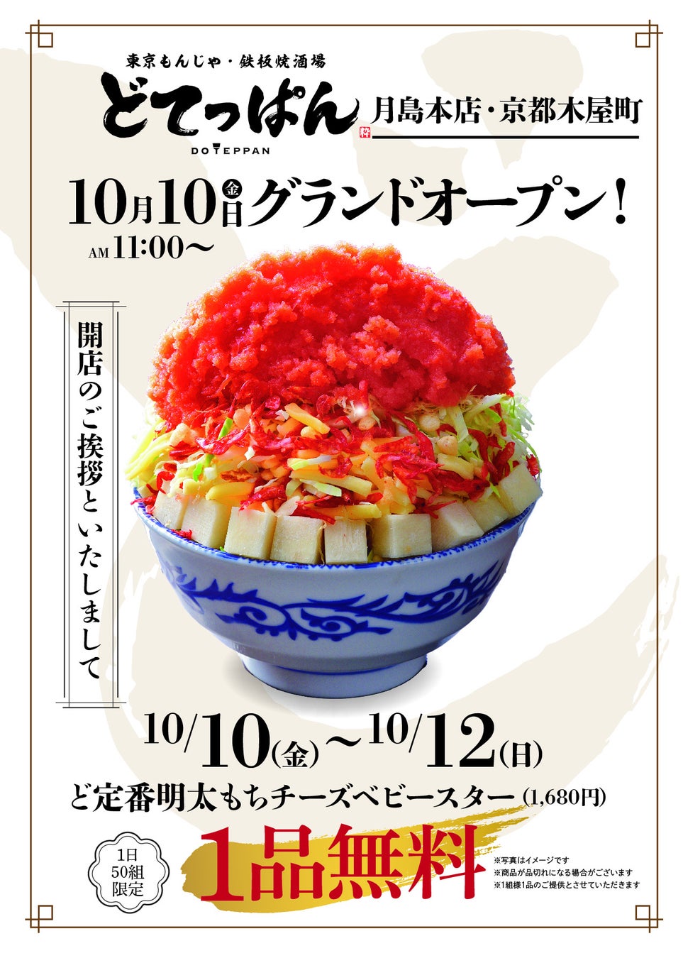 オープンを記念して、ご来店のお客様へ大人気メニュー「ど定番 明太もちチーズベビースターもんじゃ」(通常1,530円)を1組様につき1品無料 でご提供いたします。