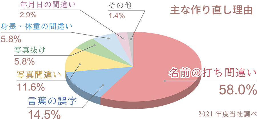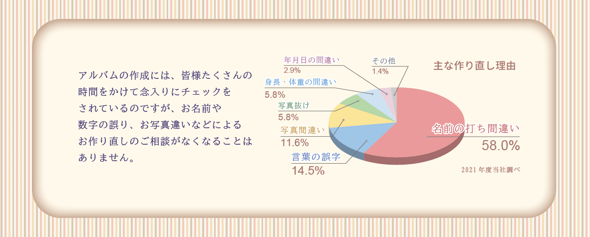 複数人で入念に確認するアルバム制作ですが、児童の名前や数字の誤り、写真違いなどによる作り直しの相談が当社には多く寄せられます。