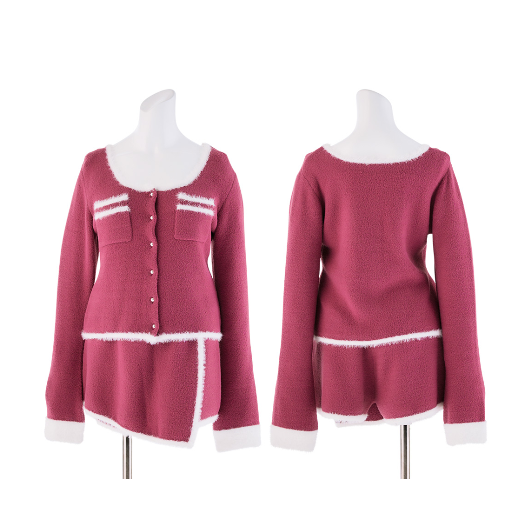 パールボタンで上品にまとめたカーディガンと、キュートであざといスカートパンツのセットアップ。