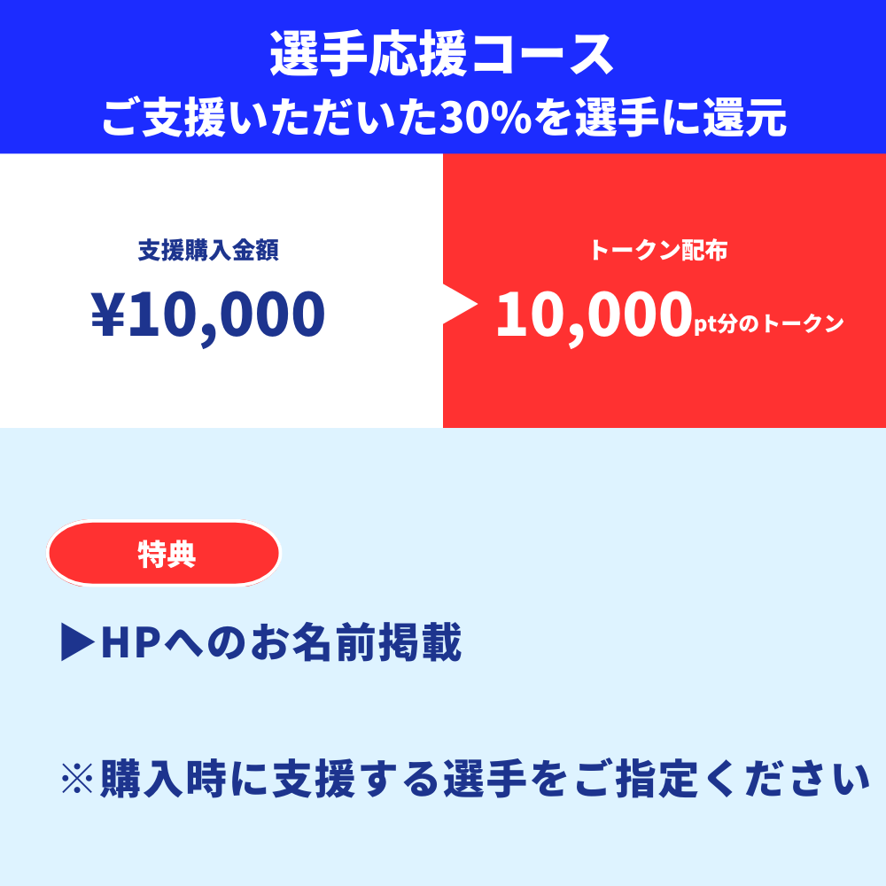 選手応援コース | ・BBトークン(10,000 pt分) ・選手応援(こちらのコースの売上の30%をご指定の選手に還元) ・HPへのお名前掲載 ・トークン保有特典・投票企画および抽選特典への参加 |