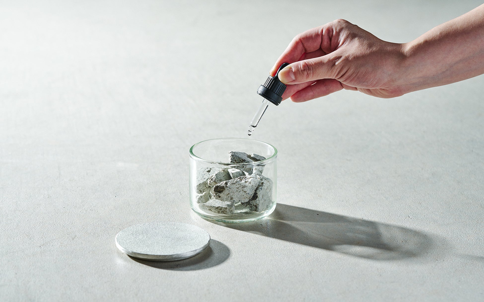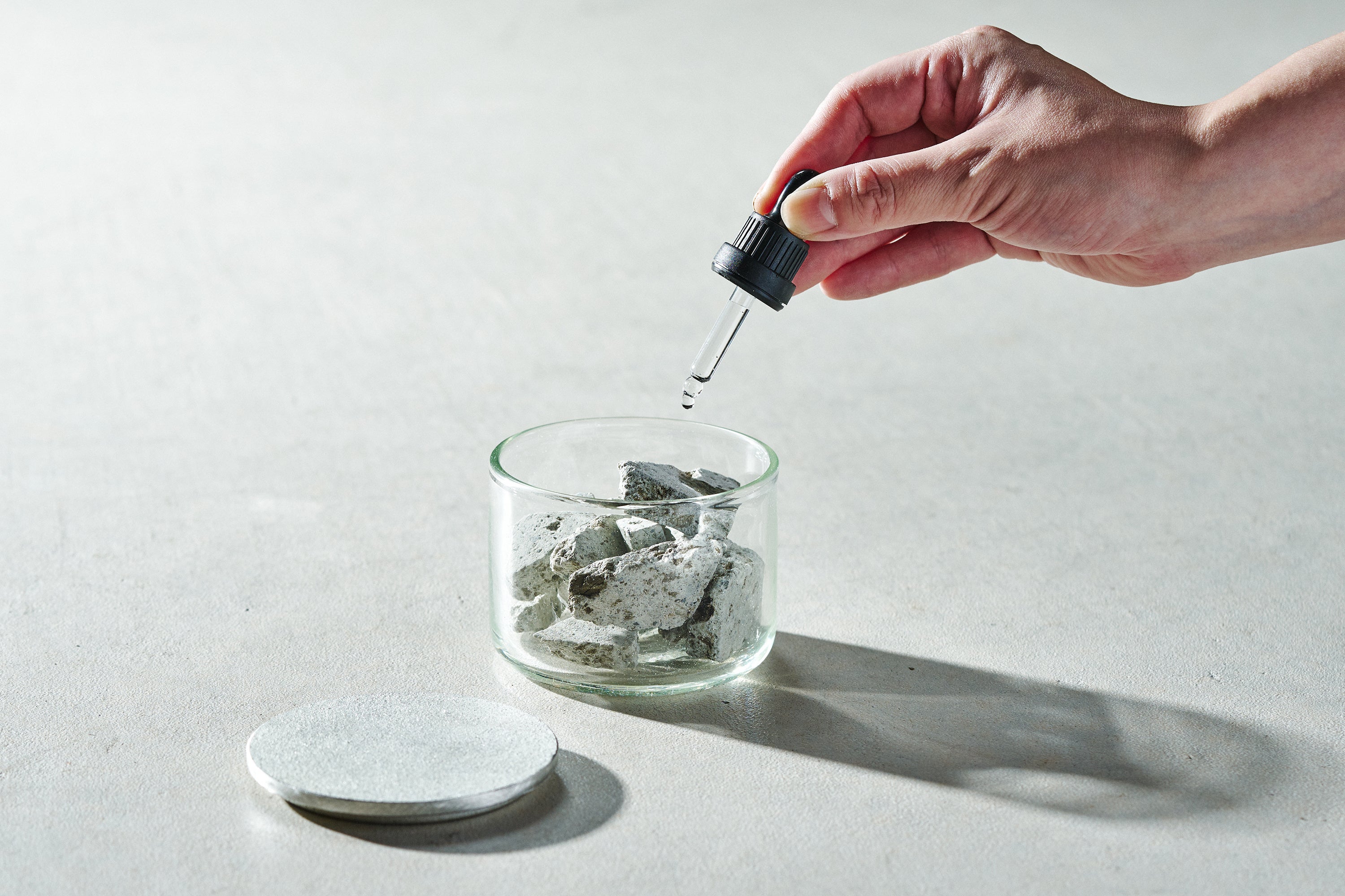 ナガエプリュスのOya Incense Setの香皿をはじめ、大谷石のコースターなどのプロダクトの製造過程で発生する端材はコンクリートに骨材として使用されるなど限定的な利用がほとんどです。それら端材を大谷石の多孔質構造を利用したアロマディフューザーとして活用するアップサイクルアイテムにしました。オリジナルで制作する器には、適切に処理された蛍光灯リサイクルガラスを全量使用しており、大谷石とともに仄かな緑色が特徴です。