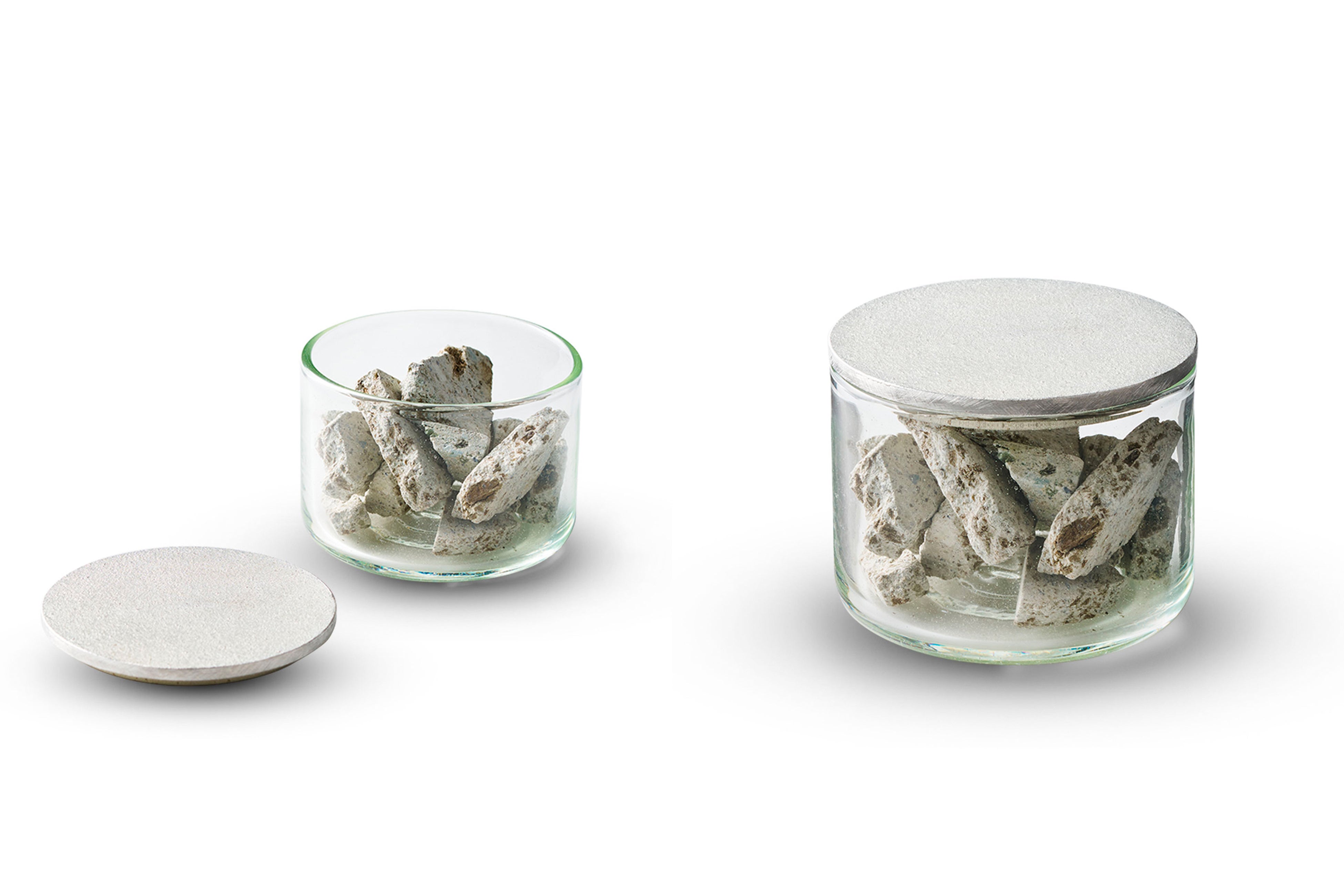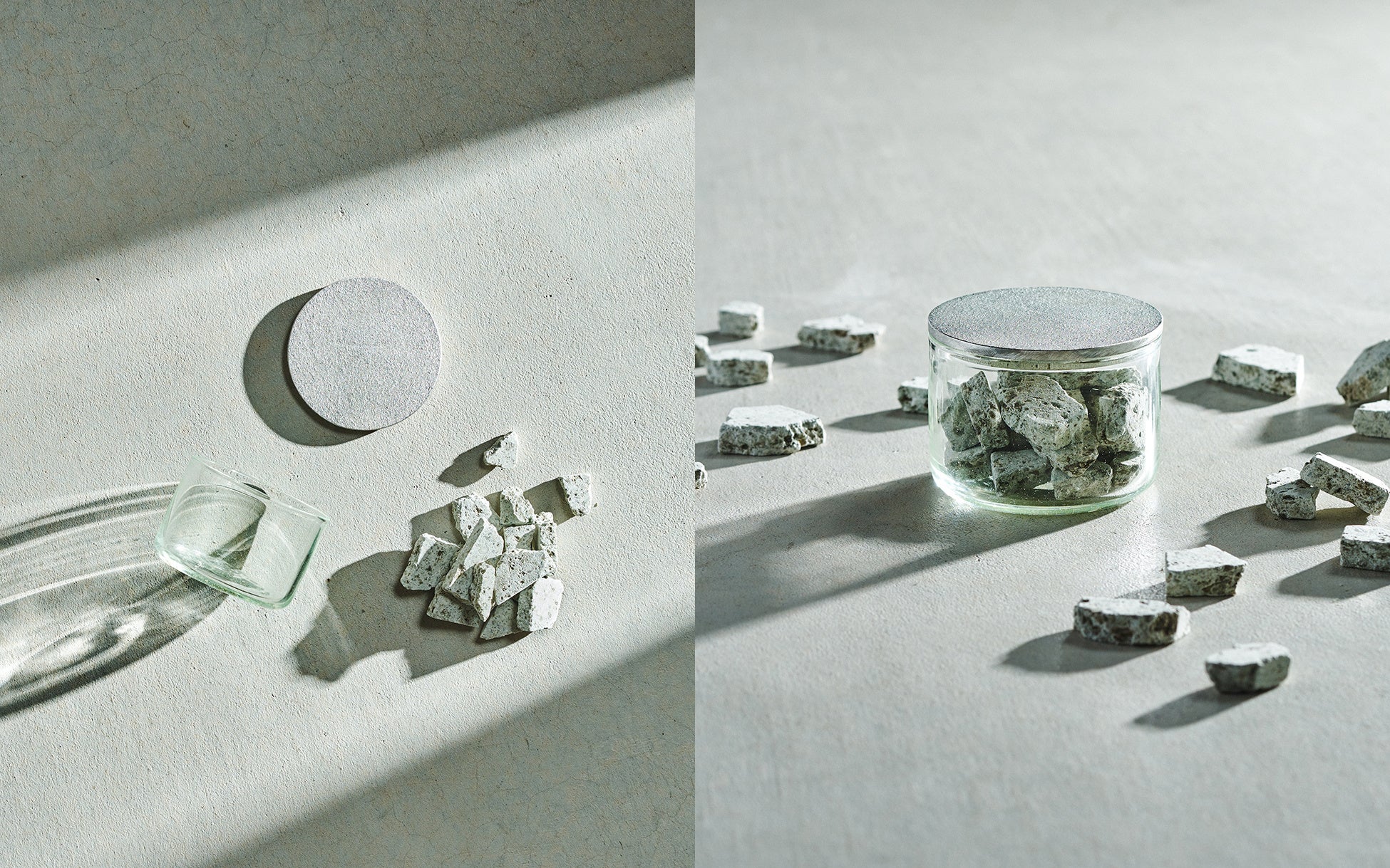 素材 :錫(リサイクル)/ 大谷石の端材 / 蛍光灯リサイクルガラス