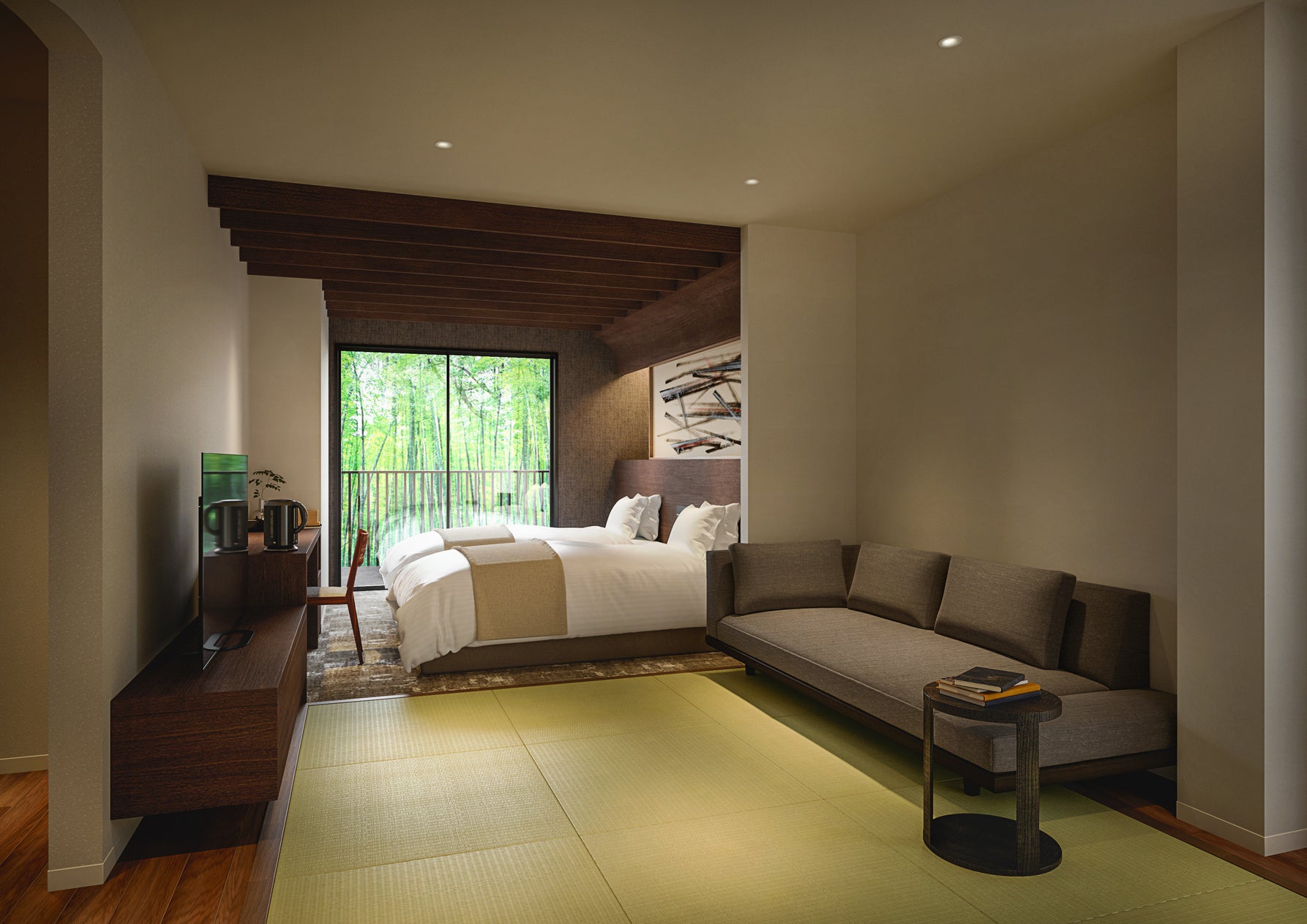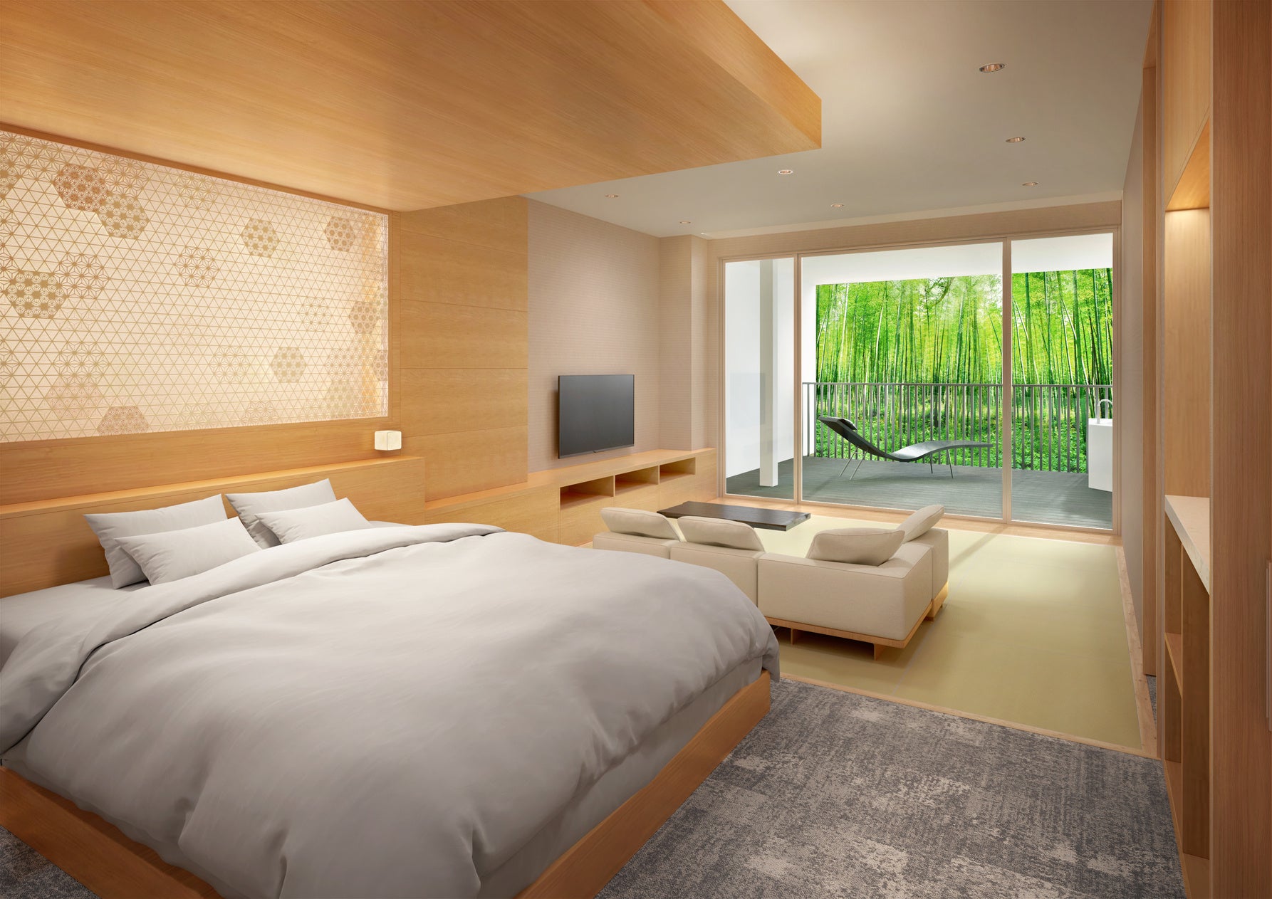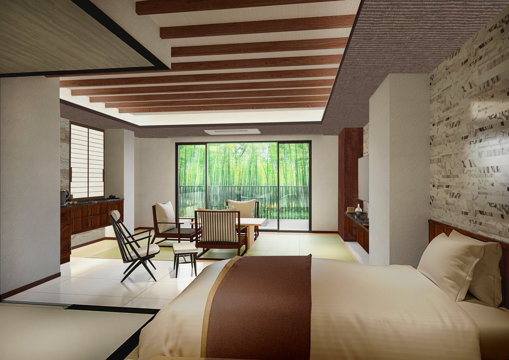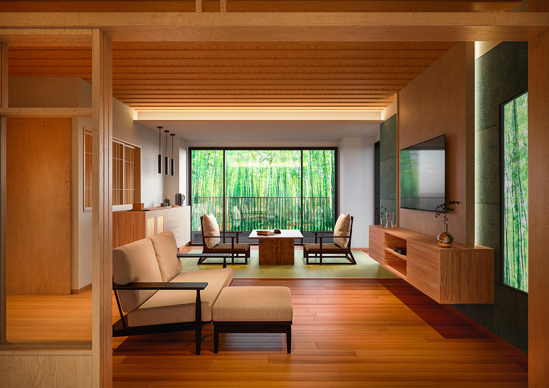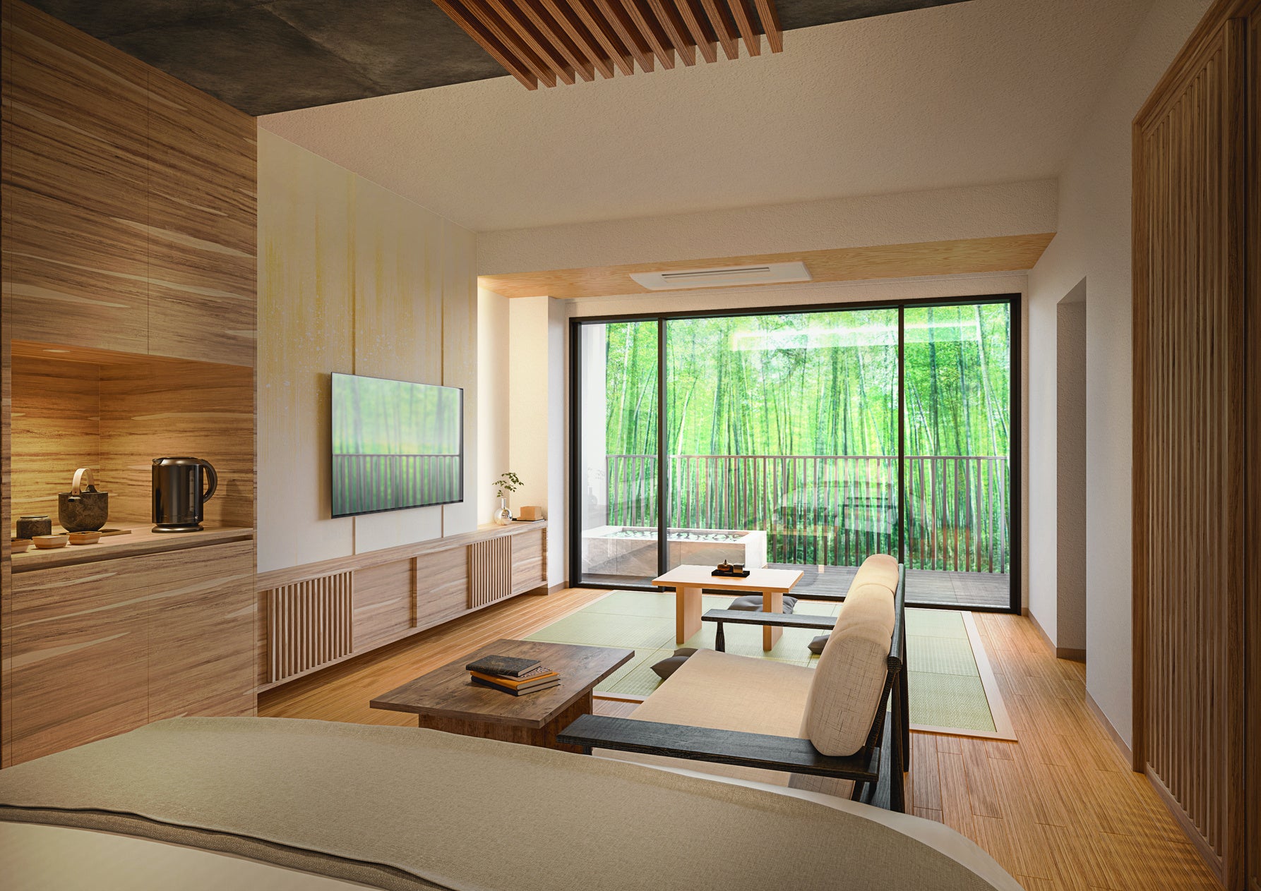 今回新設されたリバーサイドの8室は、それぞれが異なる雰囲気を持つ、個性豊かなデザインが特徴です。全ての客室には専用の露天風呂が完備されており、贅沢なひとときをお過ごしいただけます。