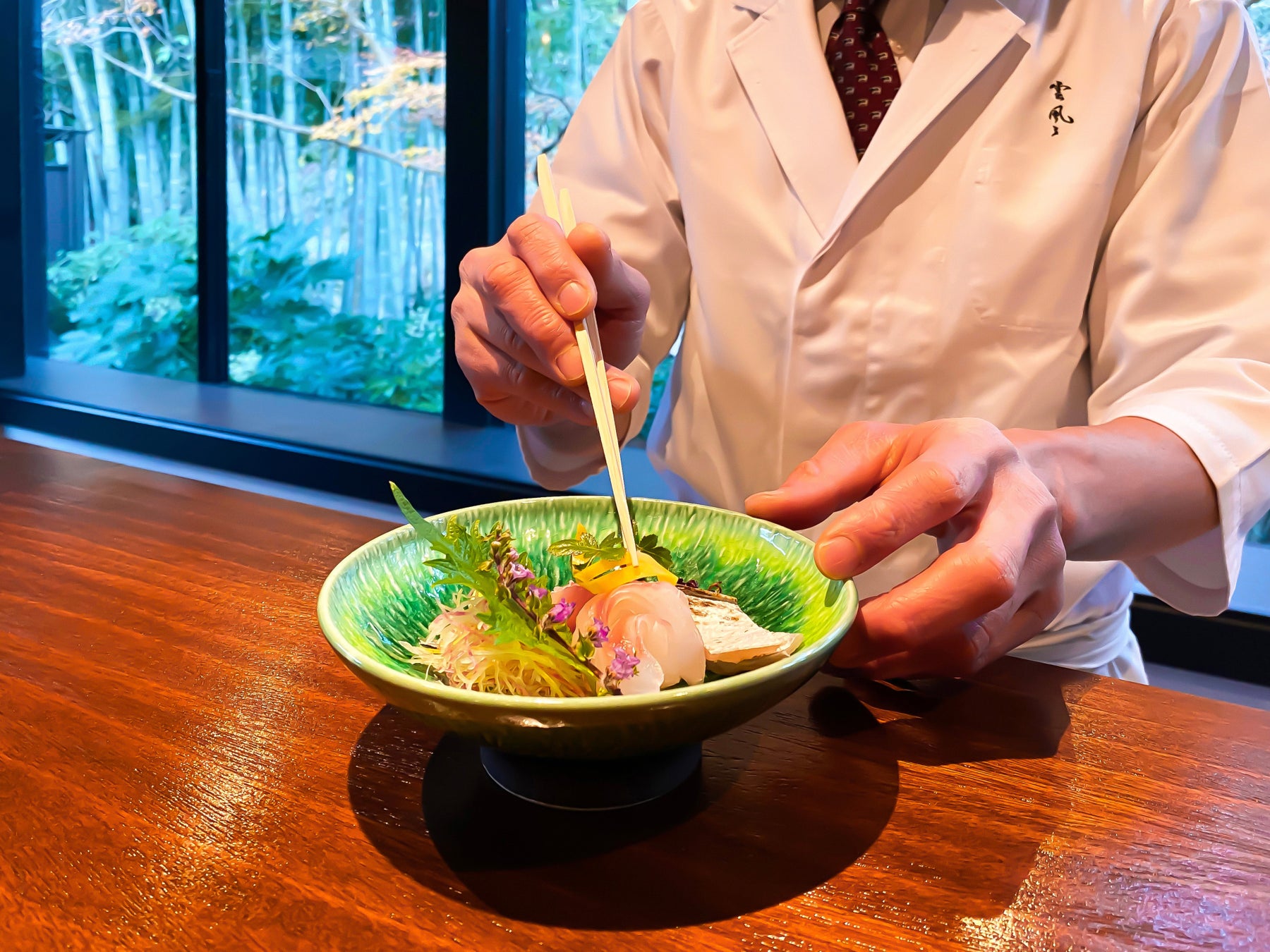 ダイニング会場では、料理長が目の前で仕上げる割烹スタイルの会席料理を提供します。