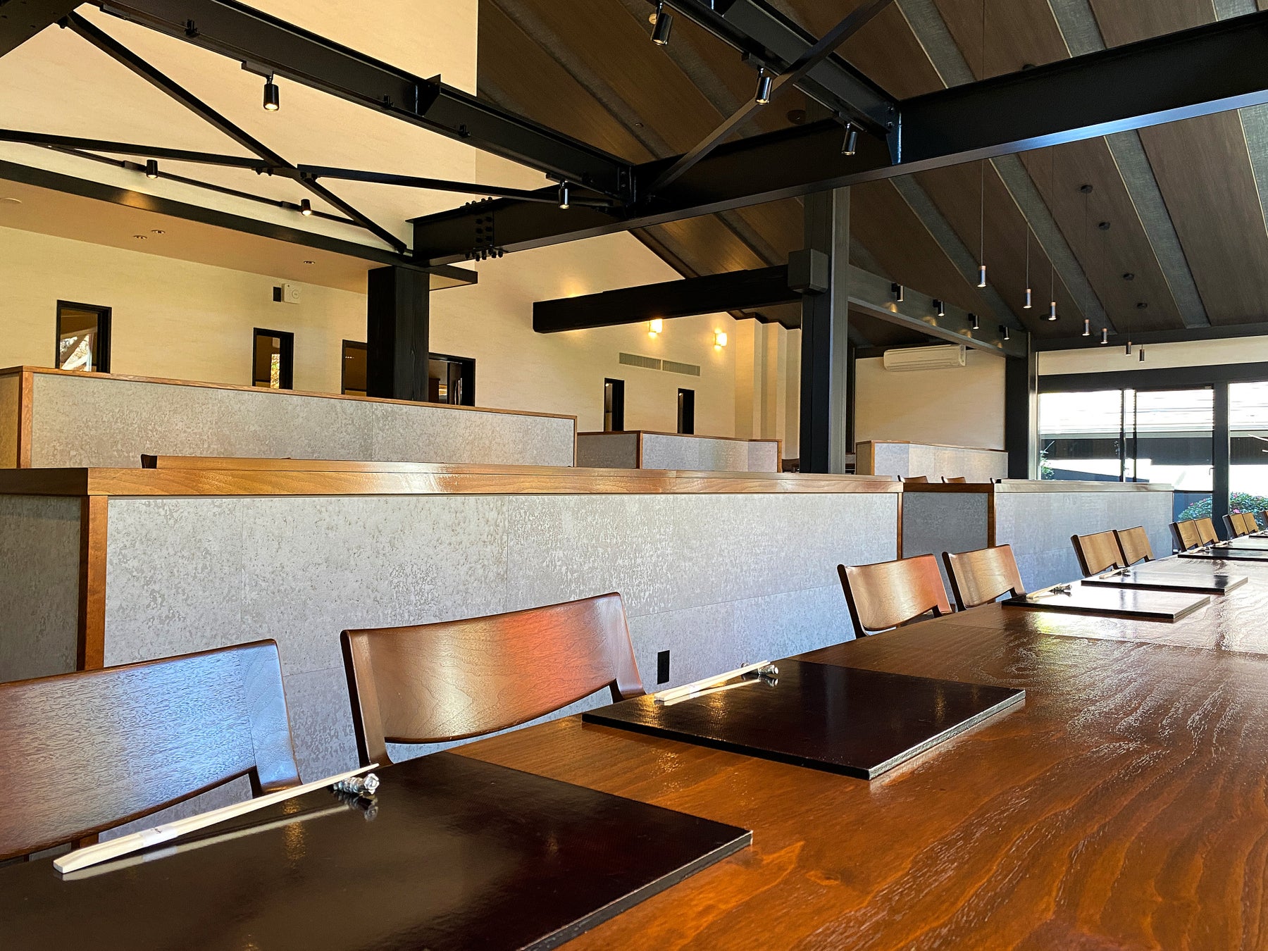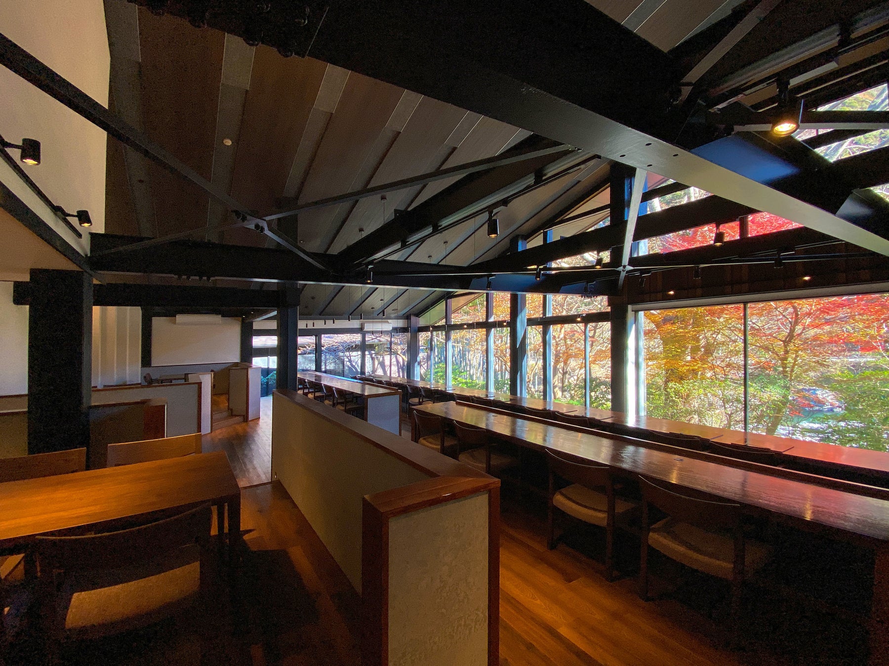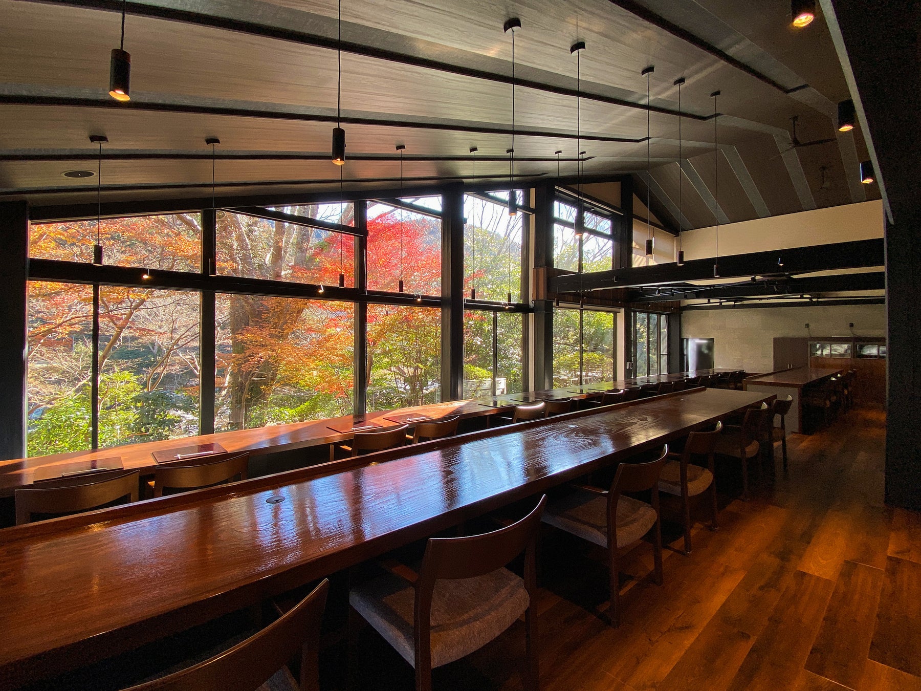 広がる大きな窓からは四季折々の美しい自然が広がり、料理を引き立てる静寂と調和の空間が広がります。