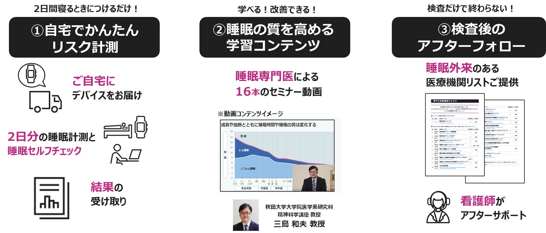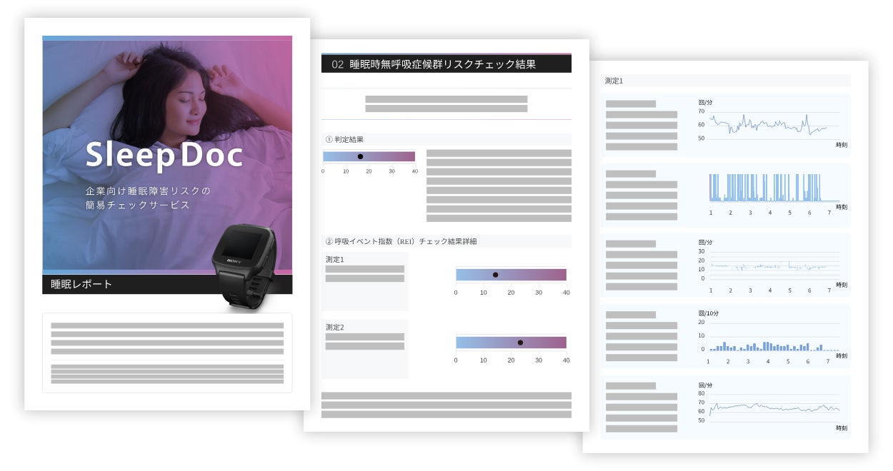 Sleep Docは、スマートウォッチ型のウェアラブルデバイスを睡眠時に装着して、2日間分の睡眠計測をすることで、睡眠時無呼吸症候群のリスクを自宅で簡単にチェックできるサービスです。計測の前に、ウェブ上で睡眠に関するセルフチェックをしていただくことで、睡眠時無呼吸症候群以外の様々な睡眠障害についても簡易的なリスクチェックを行うこともできます。運輸運送業のドライバー、プロ・アマのスポーツ選手、テレワークで運動不足が気になる会社員等、日々の健康管理とパフォーマンス改善を必要とする全ての方に、睡眠課題の可視化サービスを提供します。また、Sleep Docでは、睡眠障害リスクチェックに加え、睡眠専門医による豊富な動画コンテンツの提供や、睡眠障害リスクチェック後のフォローアップとして看護師による電話相談や睡眠専門クリニックの紹介もします。