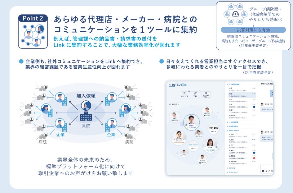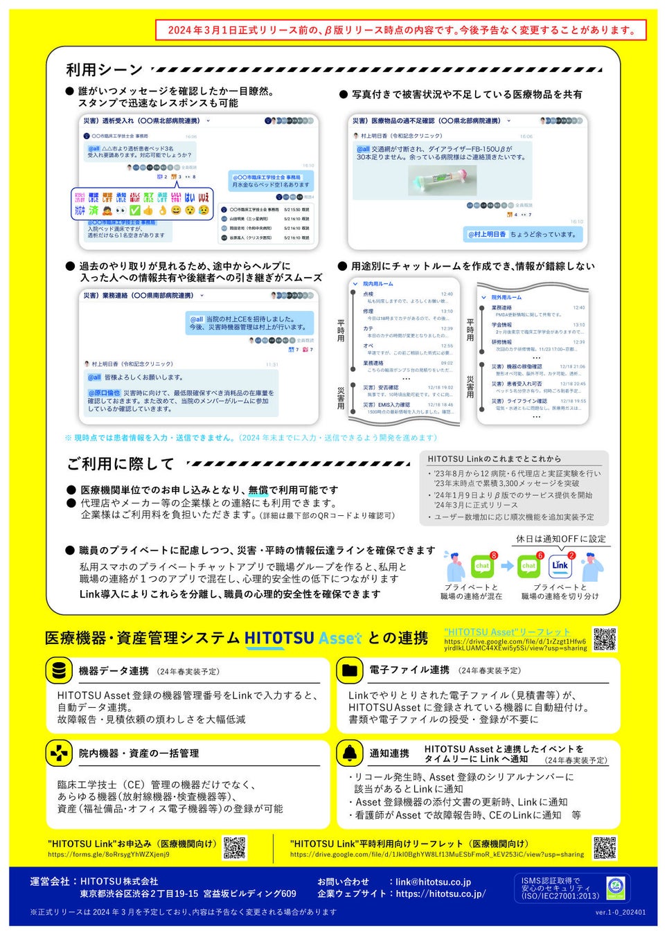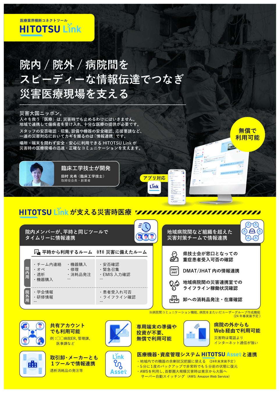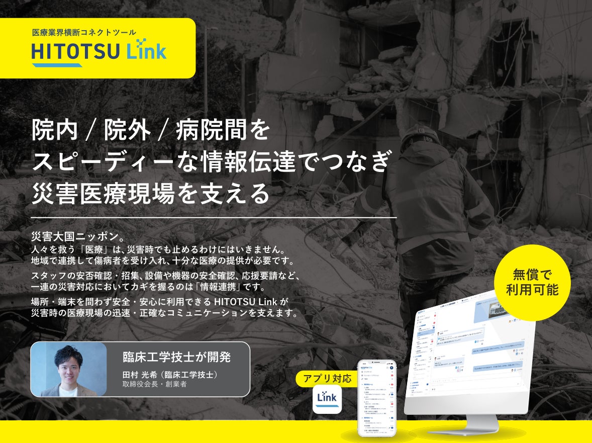 医療業界横断DXを目指すHITOTSU株式会社(本社:東京都渋谷区、代表取締役:佐藤 公彦、以下「HITOTSU」)は、平時はもちろん、災害時における院内外・病院間の安定的かつ効率的なコミュニケーションを支える医療業界横断コネクトツール "HITOTSU Link" のβ版を2024年1月9日にリリースしました。