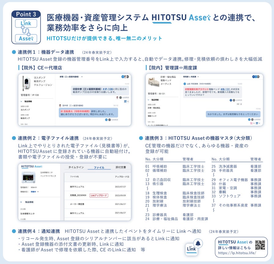 さらに、前述の医療機器・資産管理システム "HITOTSU Asset" と同じプラットフォーム利用・シングルサインオンを実現しており、また、2024年春には"HITOTSU Asset"と "HITOTSU Link" の連携をより強化し、さらなる業務効率向上を実現します。