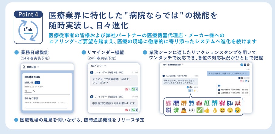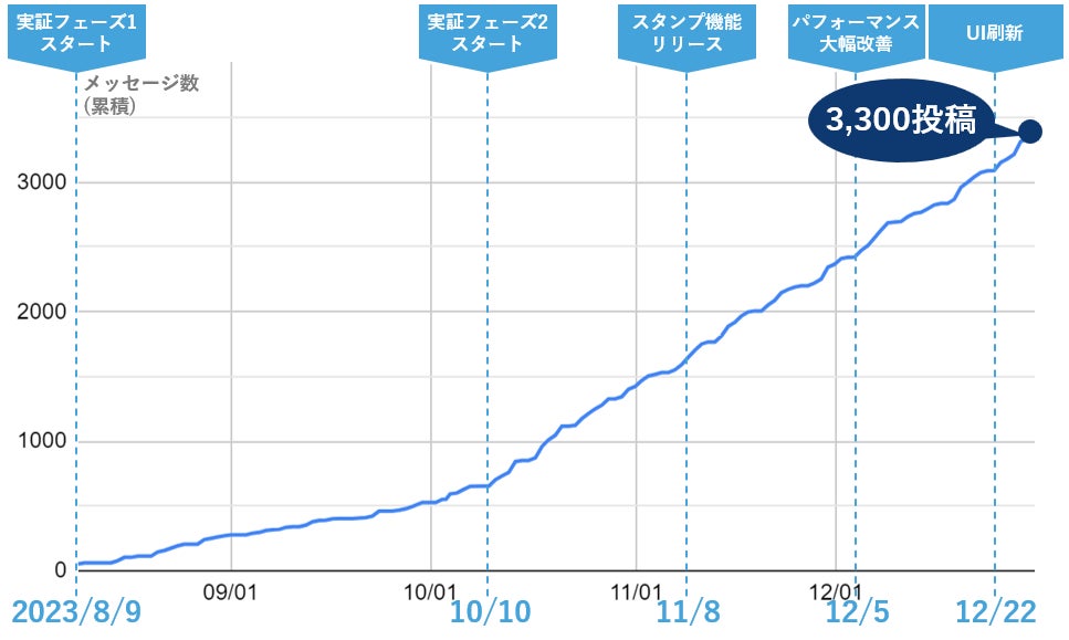 2023年8月より全国の医療機関12施設・医療機器代理店6社と実証実験を進め、累積投稿メッセージ数は2023年12月末時点で既に3,300投稿を突破しており、平時における医療機関の業務効率化および代理店の営業生産性向上の効果を実証できております。